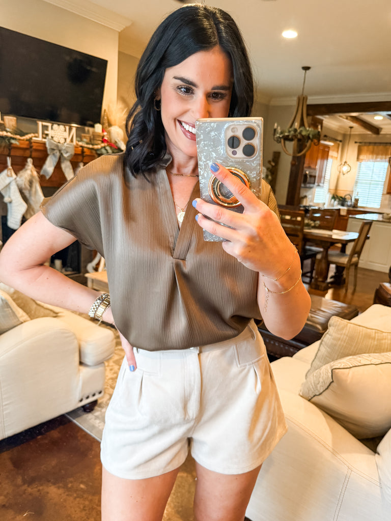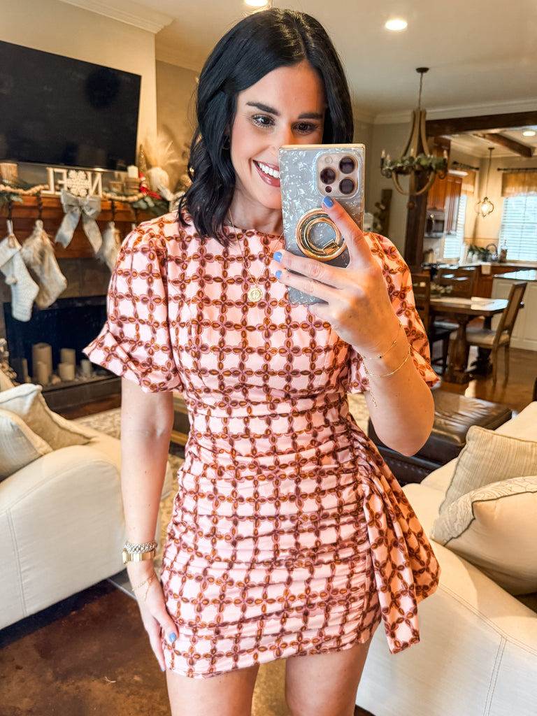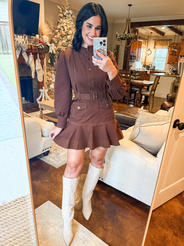 BROWN TOPSTITCHED RUFFLED HEM MINI DRESS