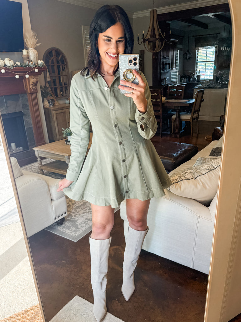 OLIVE FIT AND FLARE TWILL SHIRT DRESS