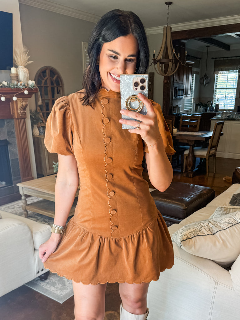 CAMEL CORDUROY RUFFLE HEM DRESS