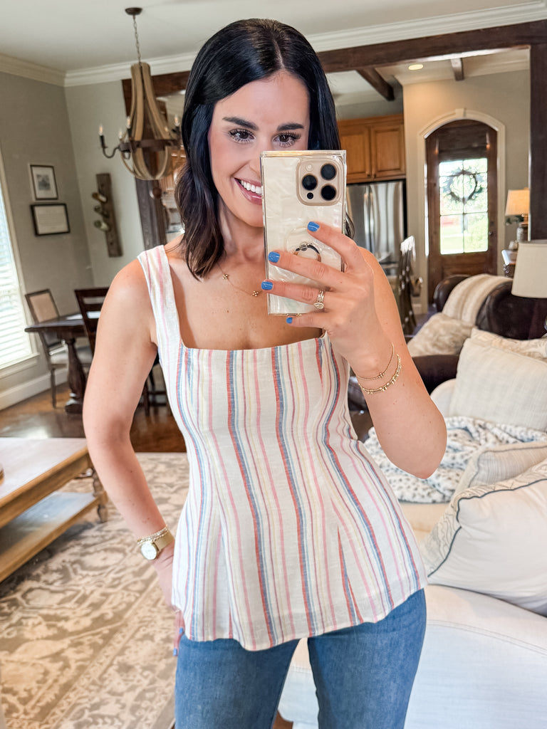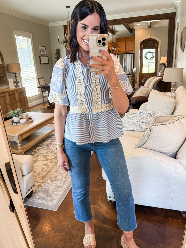 BLUE AND WHITE PEPLUM TOP WITH CROCHET DETAIL