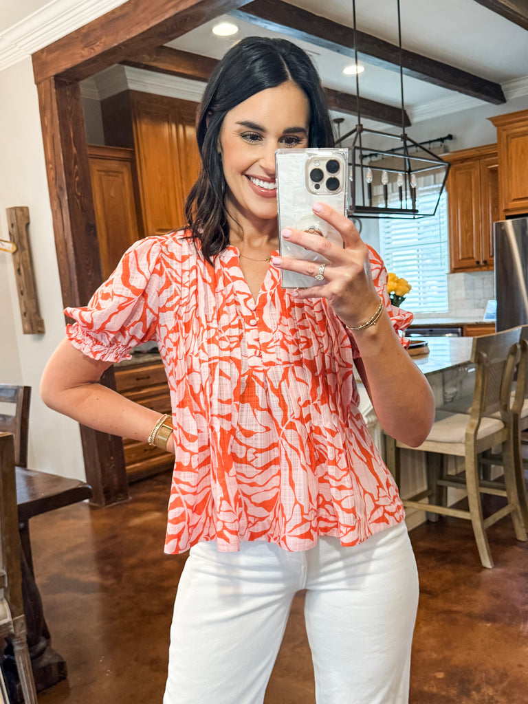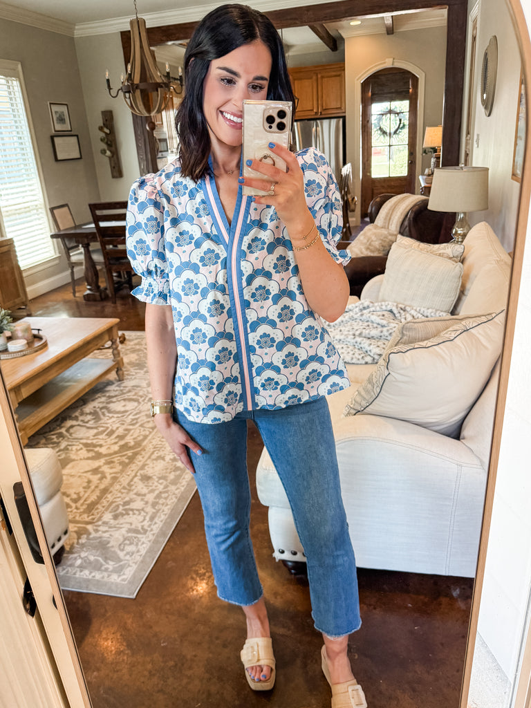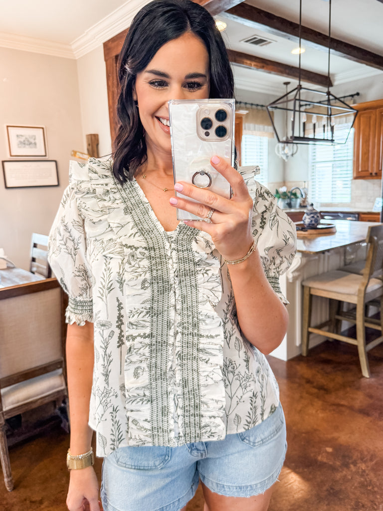 GREEN AND WHITE FLORAL SMOCKED TOP