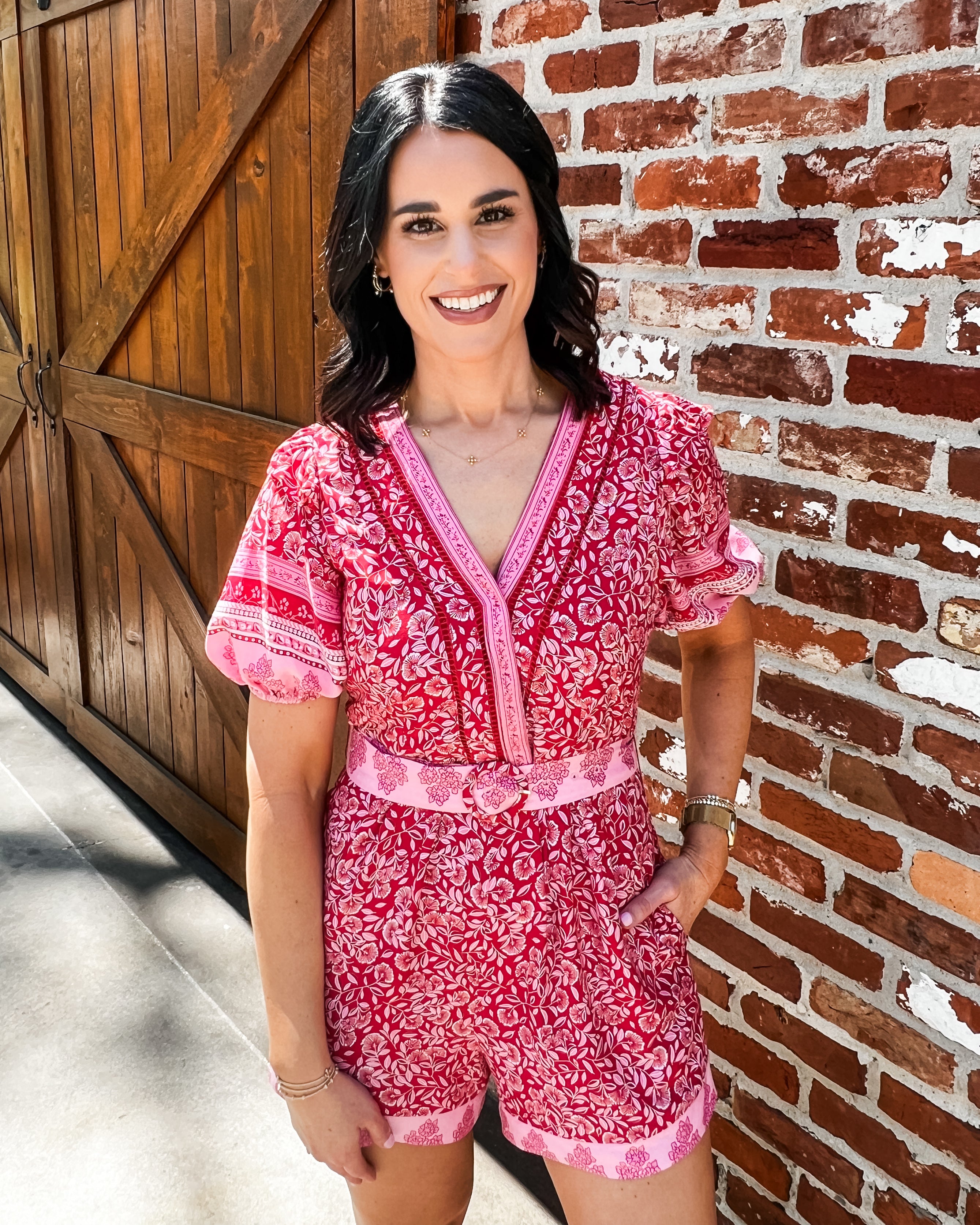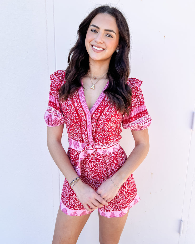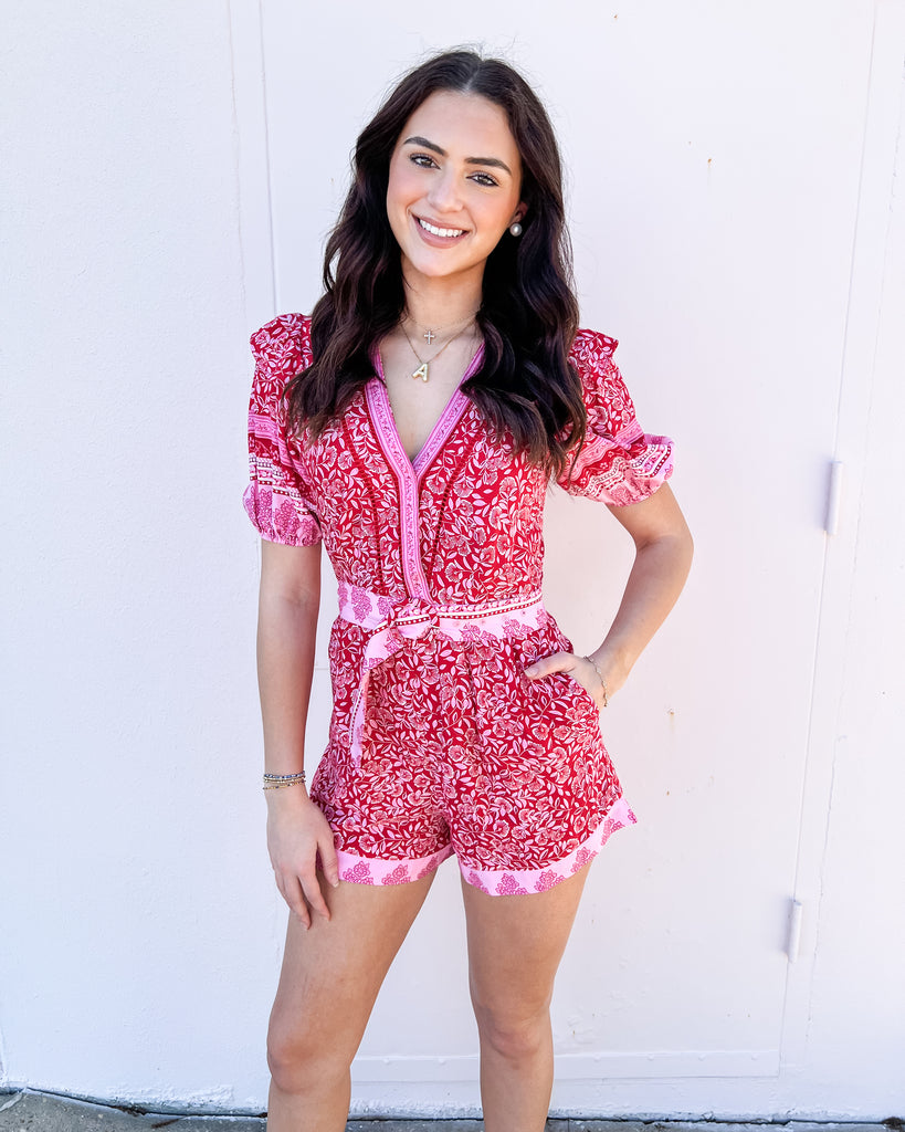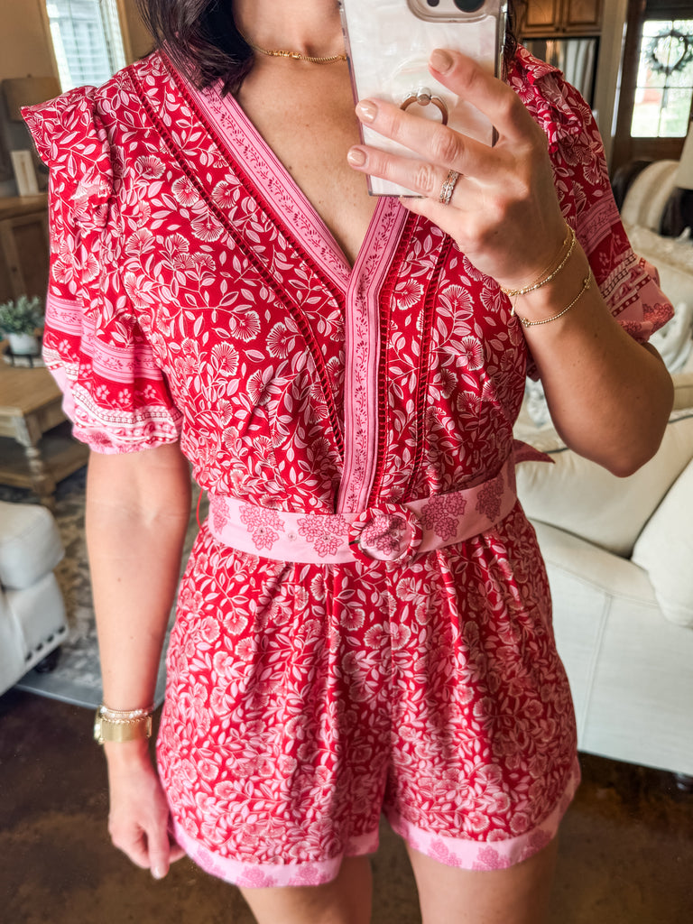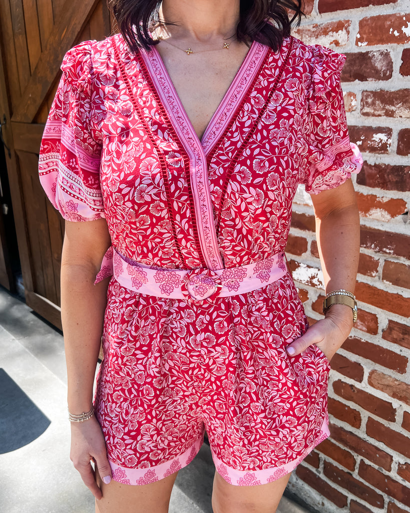 Experience effortless style and comfort with this fun romper. This v neck romper features a stunning red and pink floral print, a belted waist for a flattering fit, and a contrasting border detail for added interest. Perfect for any occasion, this romper is sure to make you stand out in style.