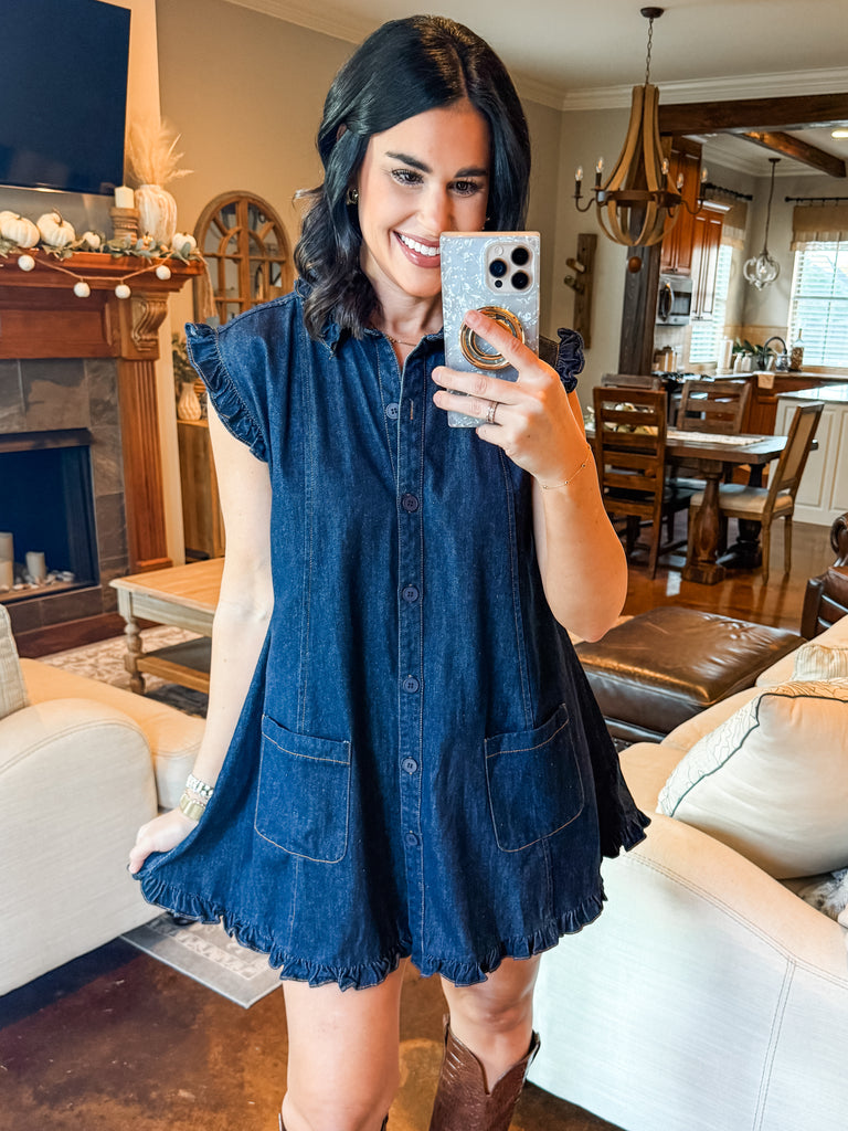 DARK WASH DENIM RUFFLE TRIM MINI DRESS