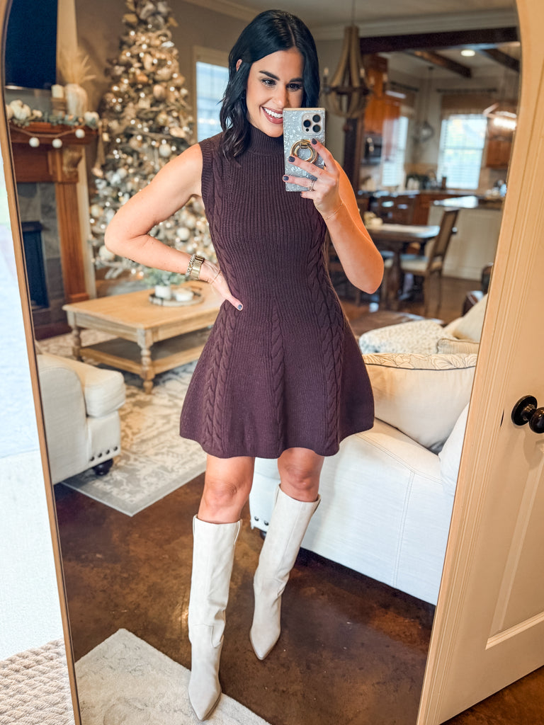 BROWN SLEEVELESS CABLE KNIT SWEATER DRESS