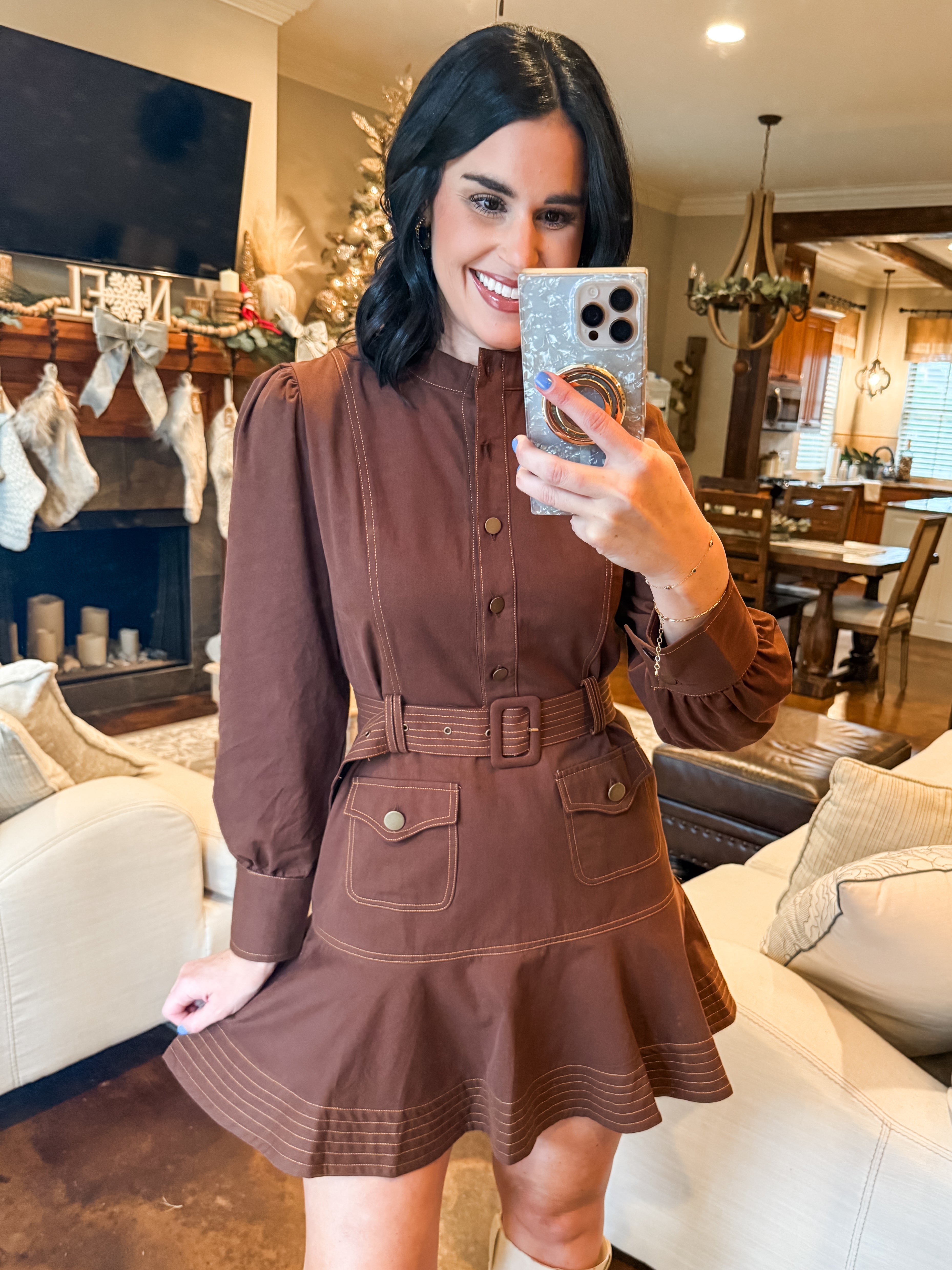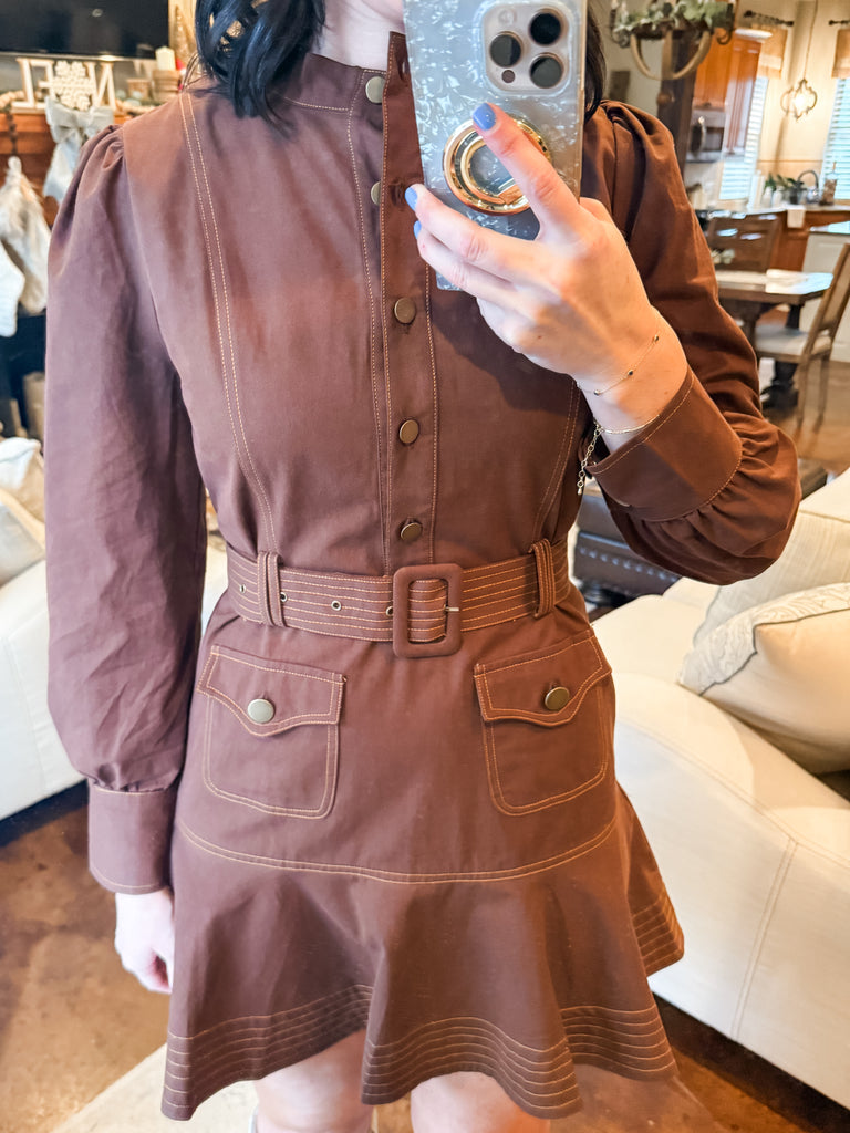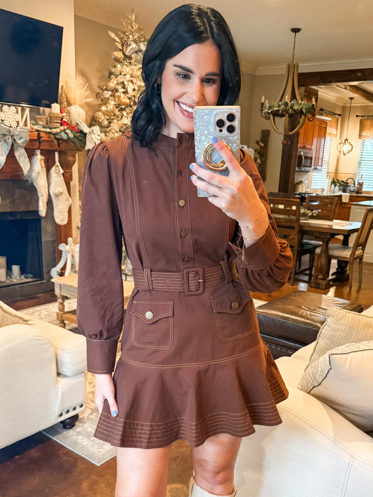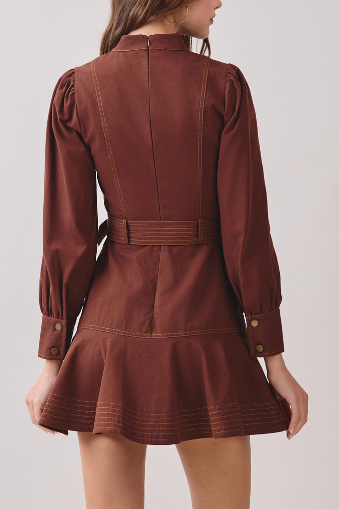 BROWN TOPSTITCHED RUFFLED HEM MINI DRESS