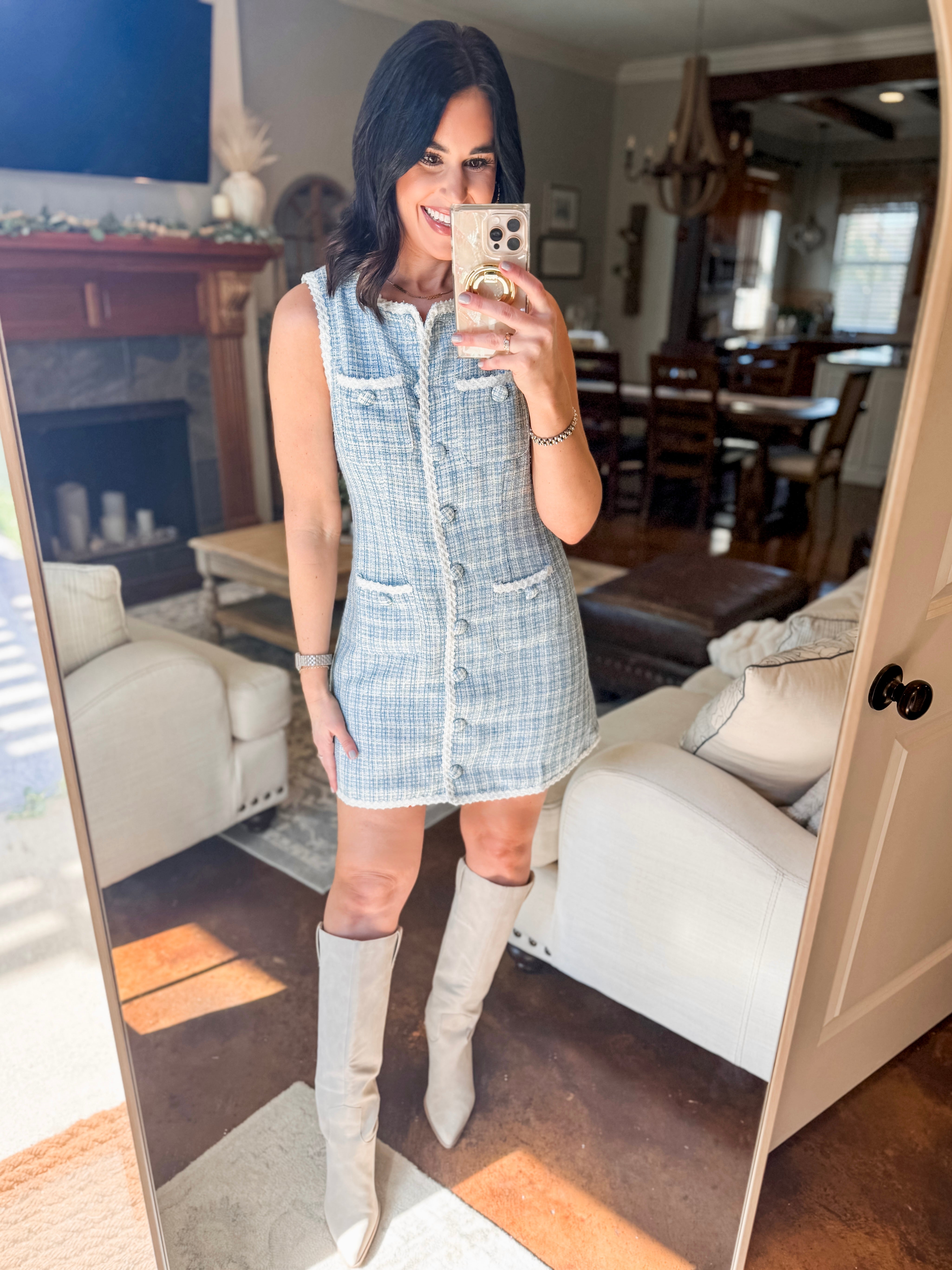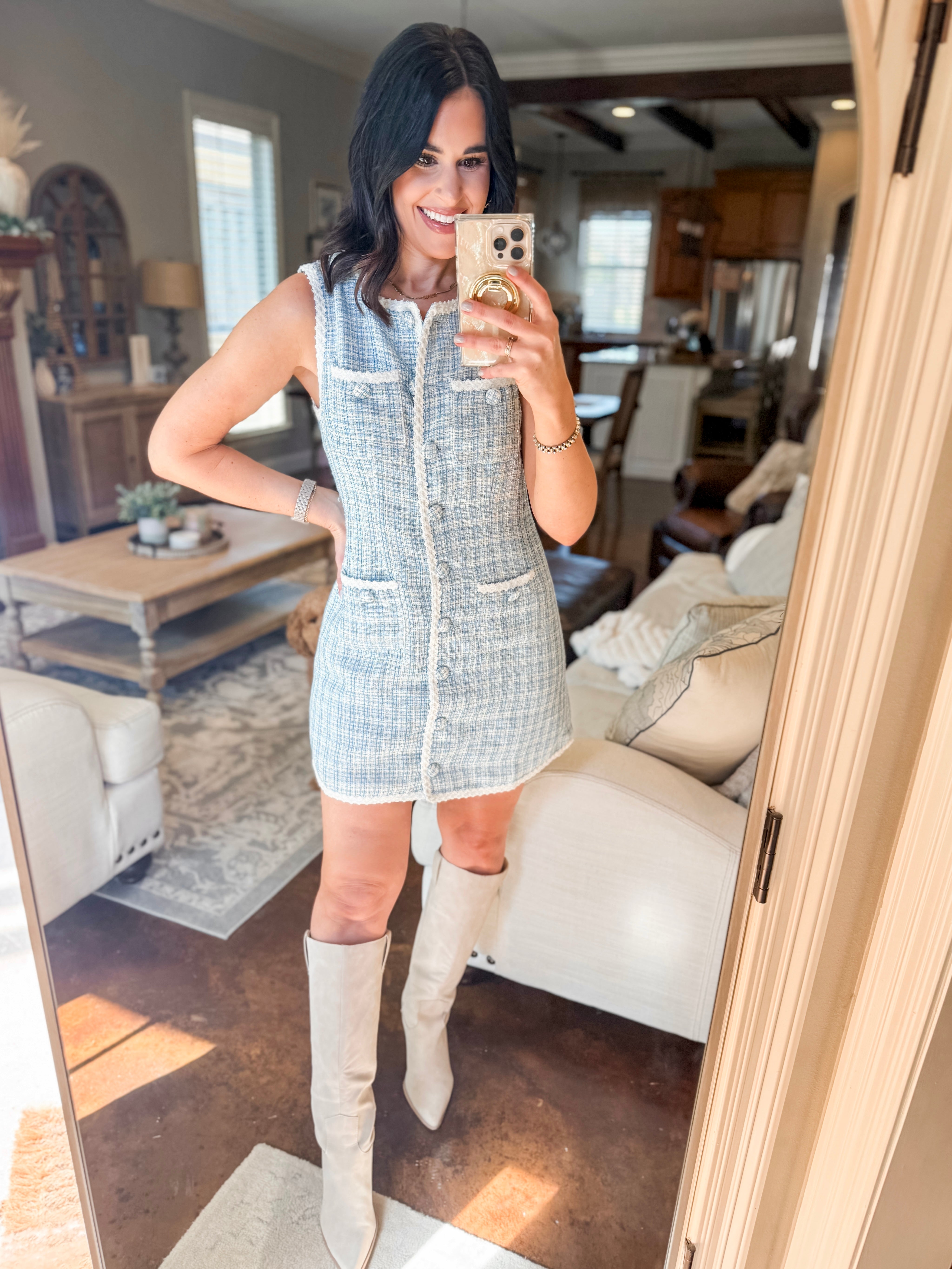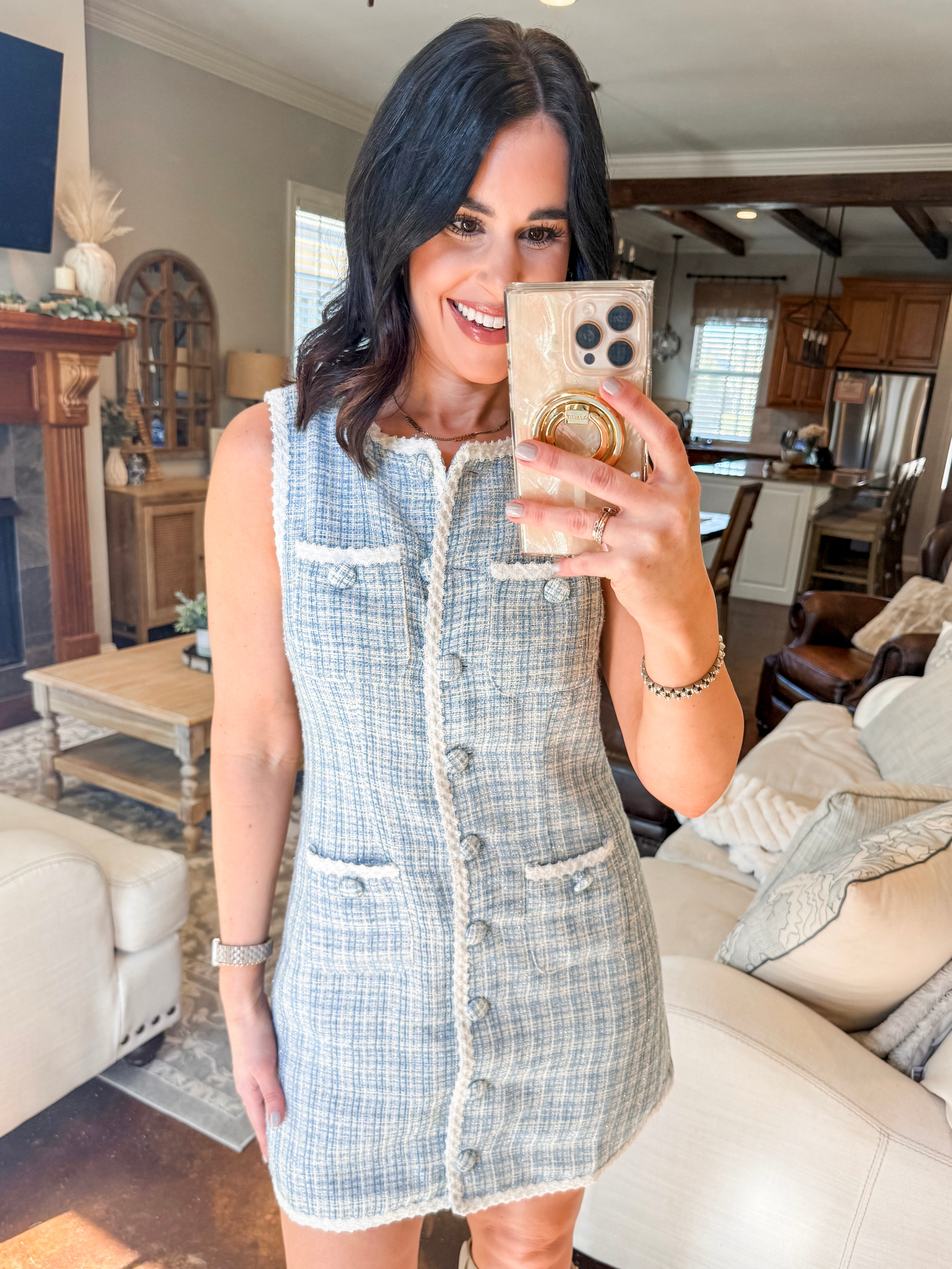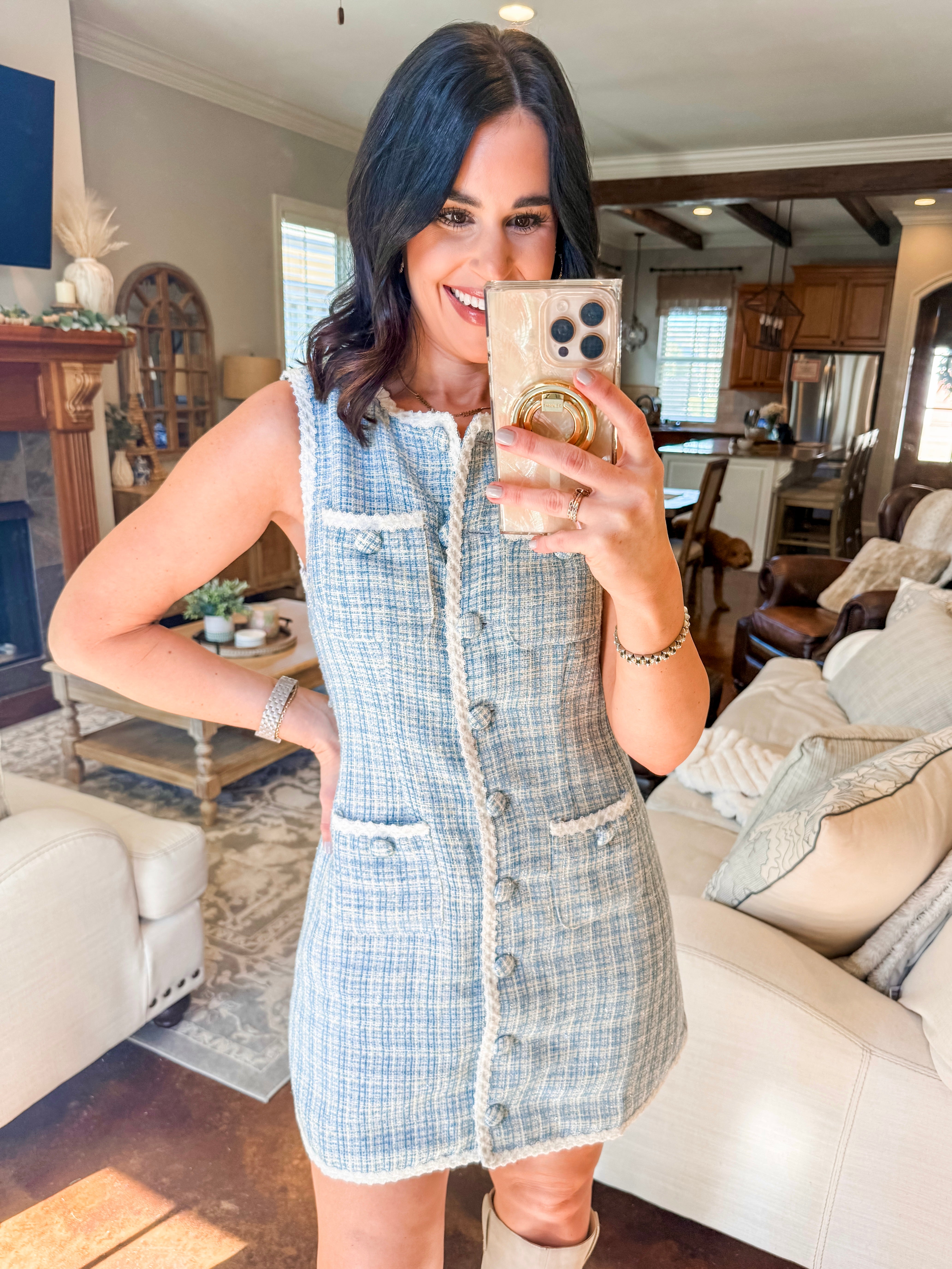 LIGHT BLUE TWEED BUTTON FRONT DRESS