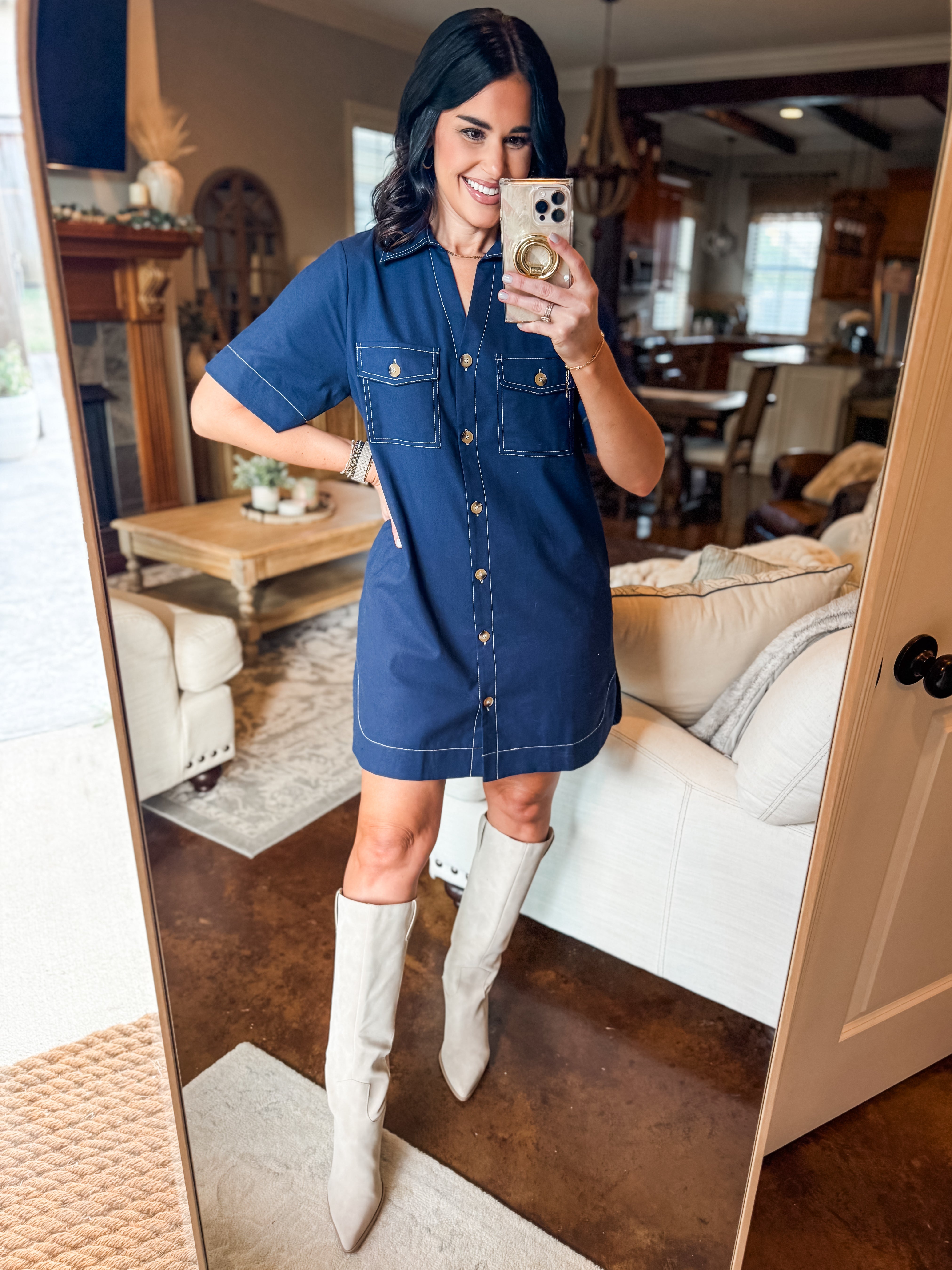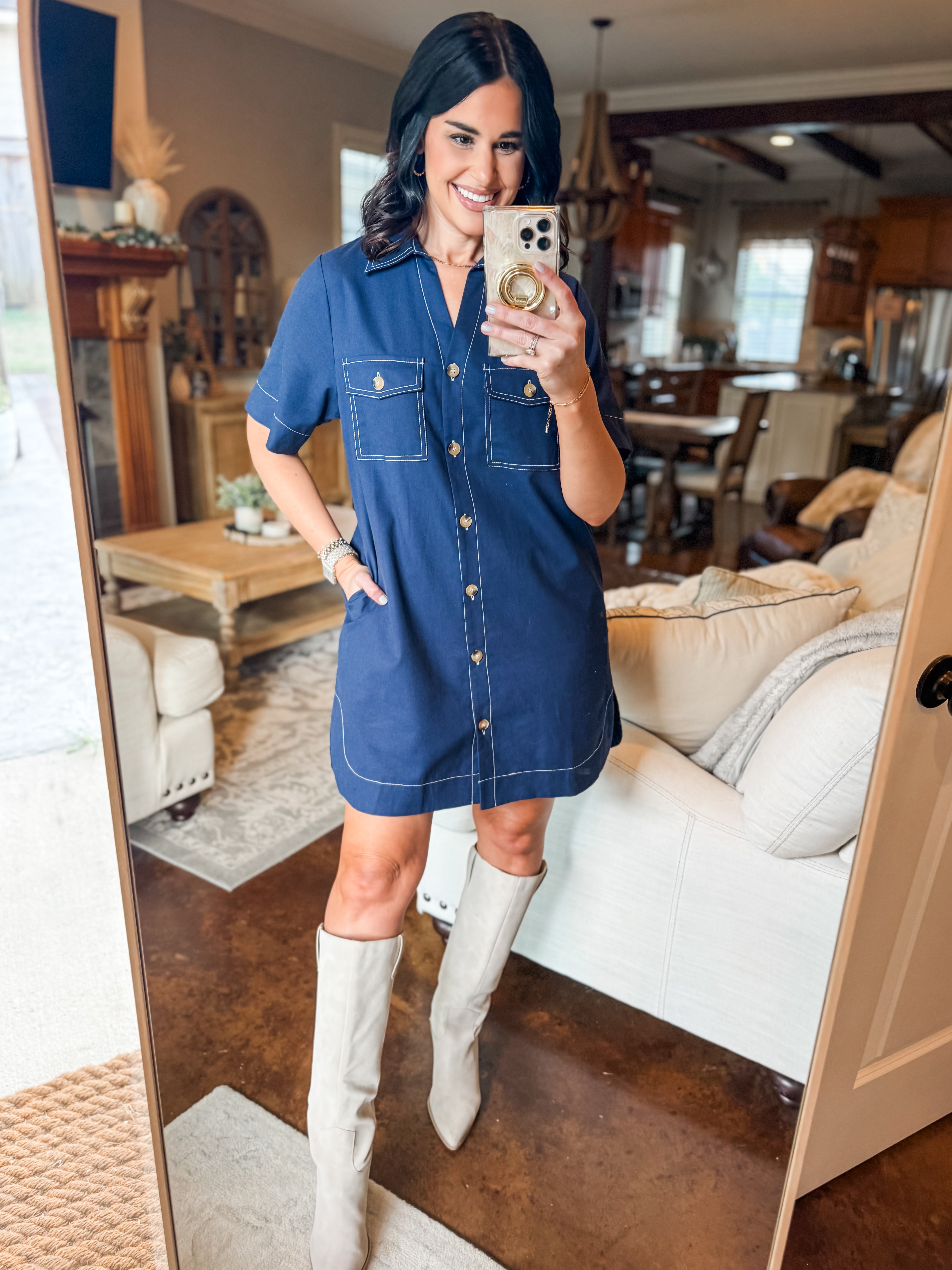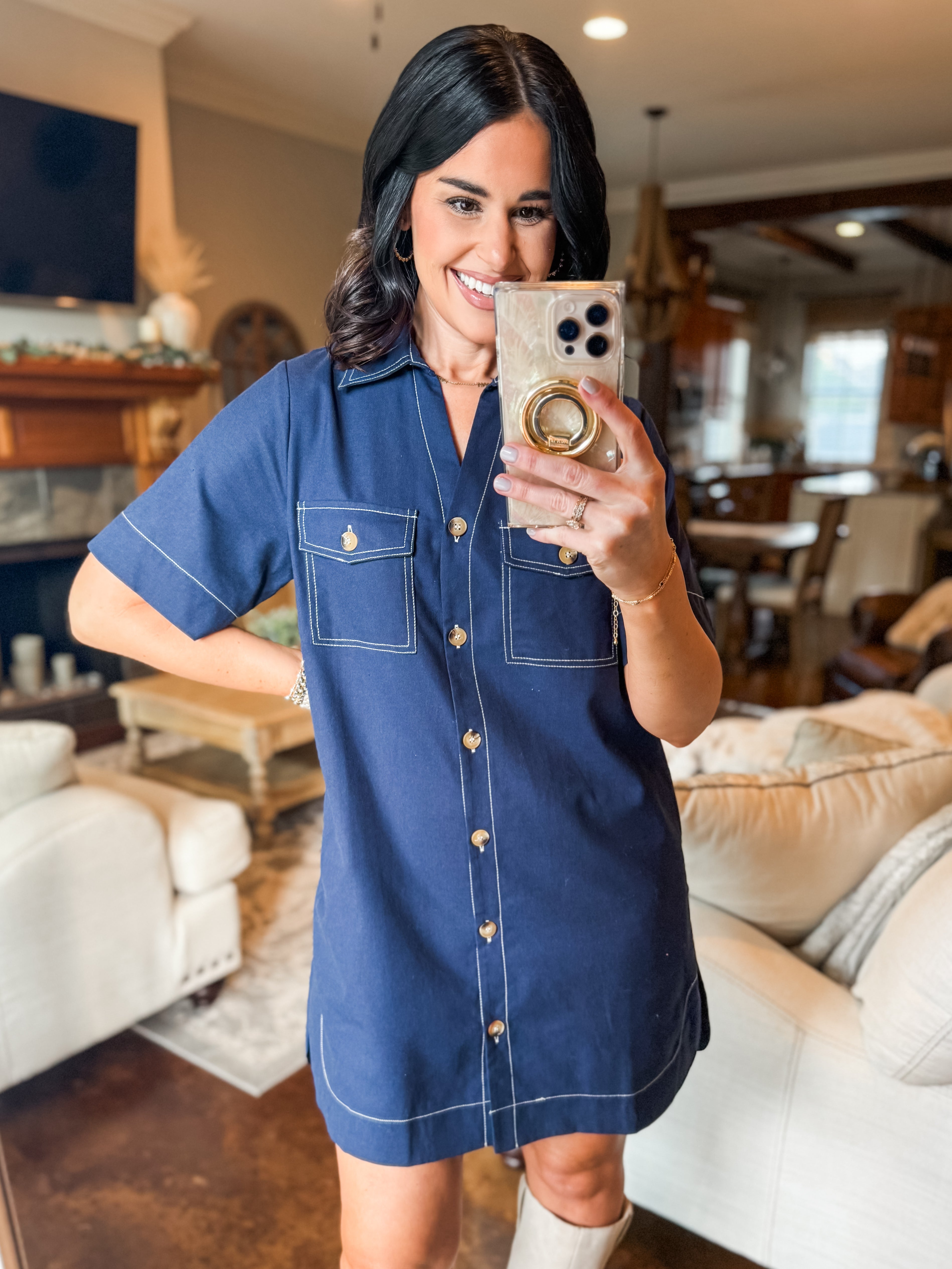 NAVY TOPSTITCH SHIRT DRESS