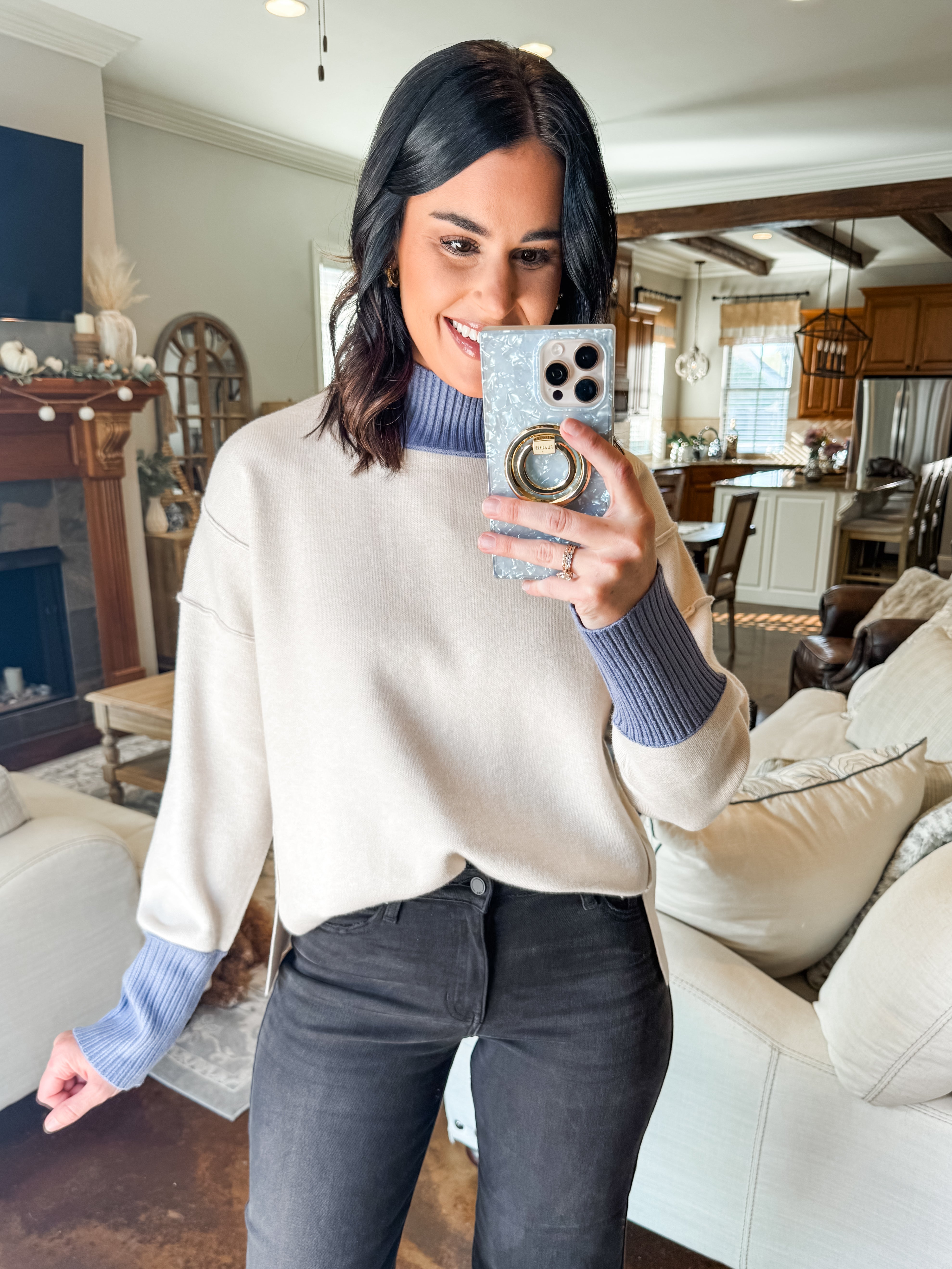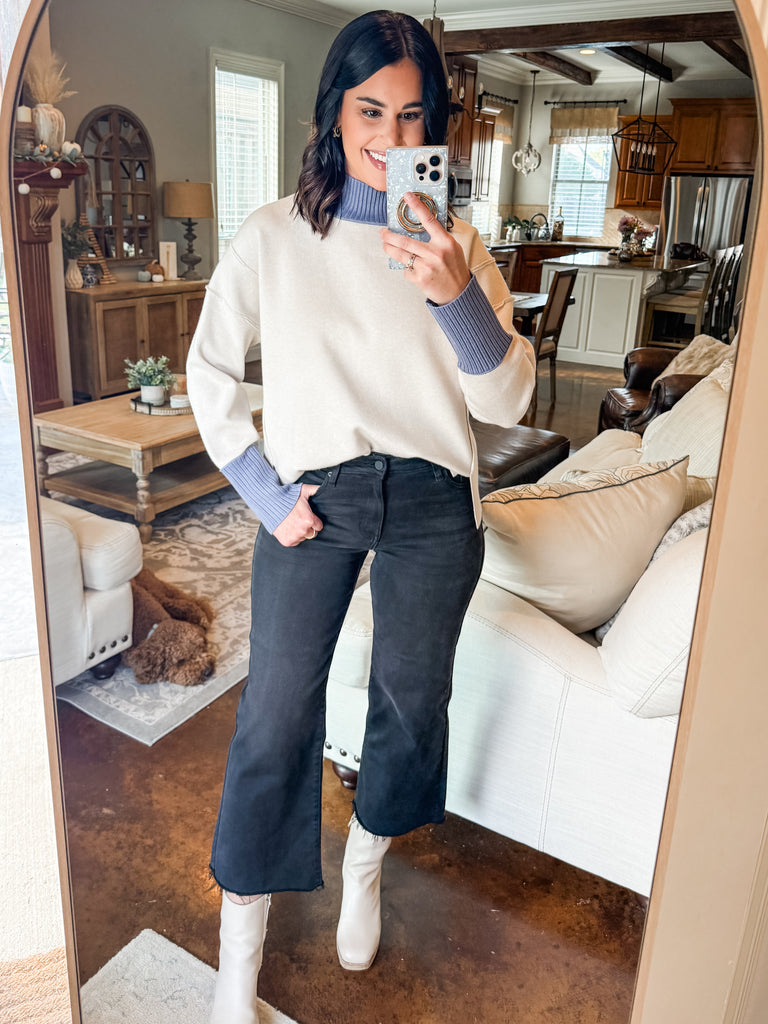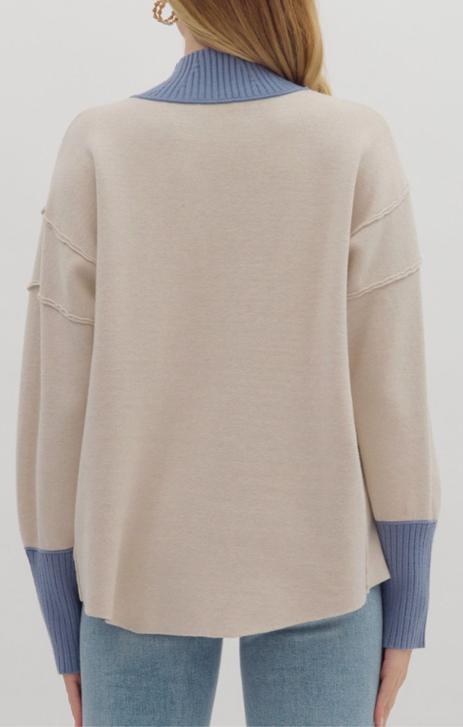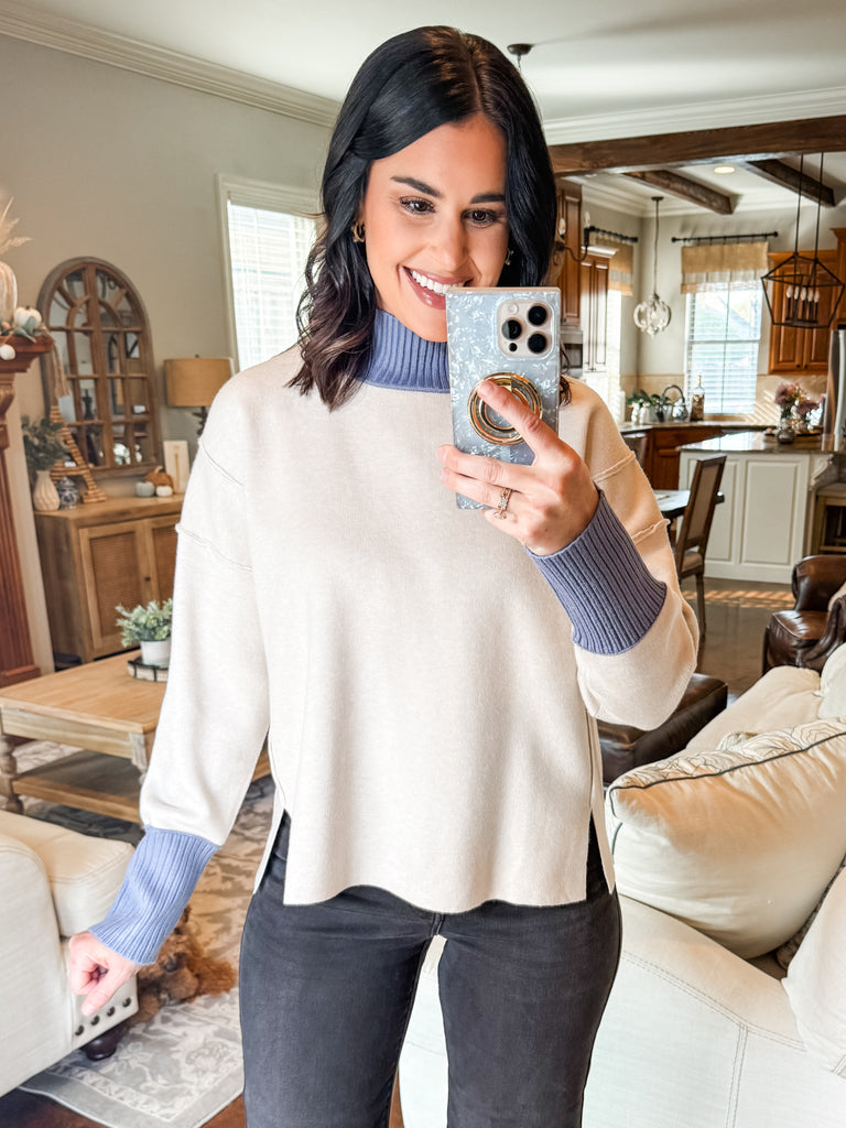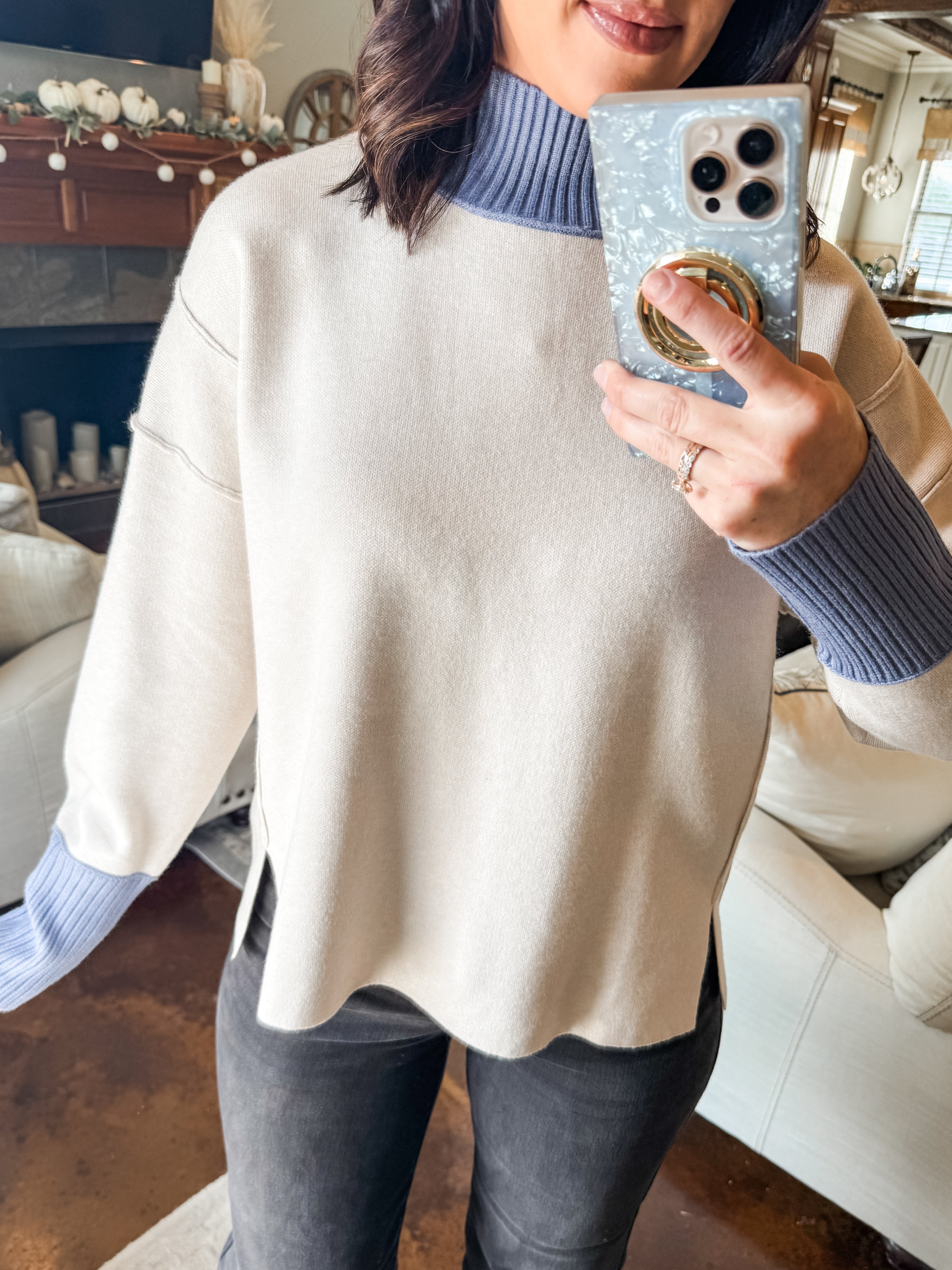 CREAM SWEATER WITH BLUE CONTRAST TRIM