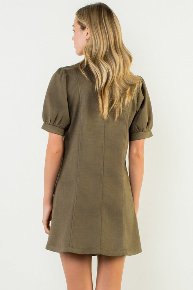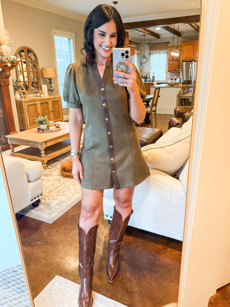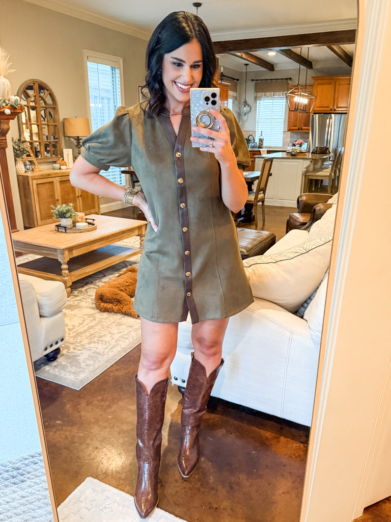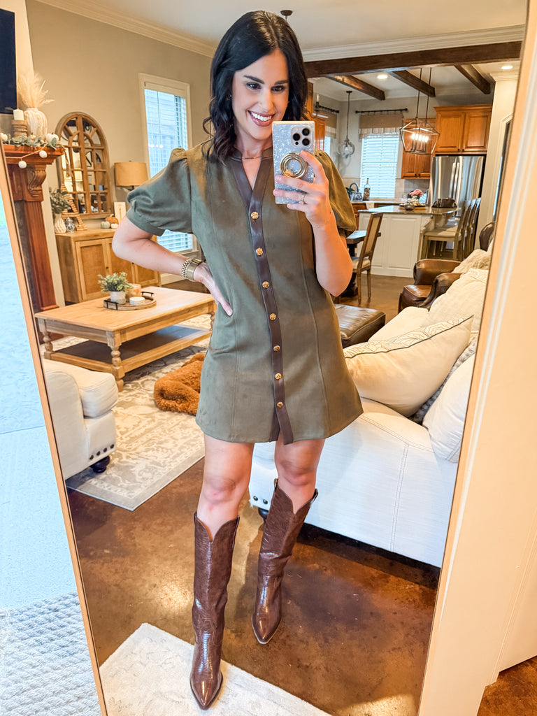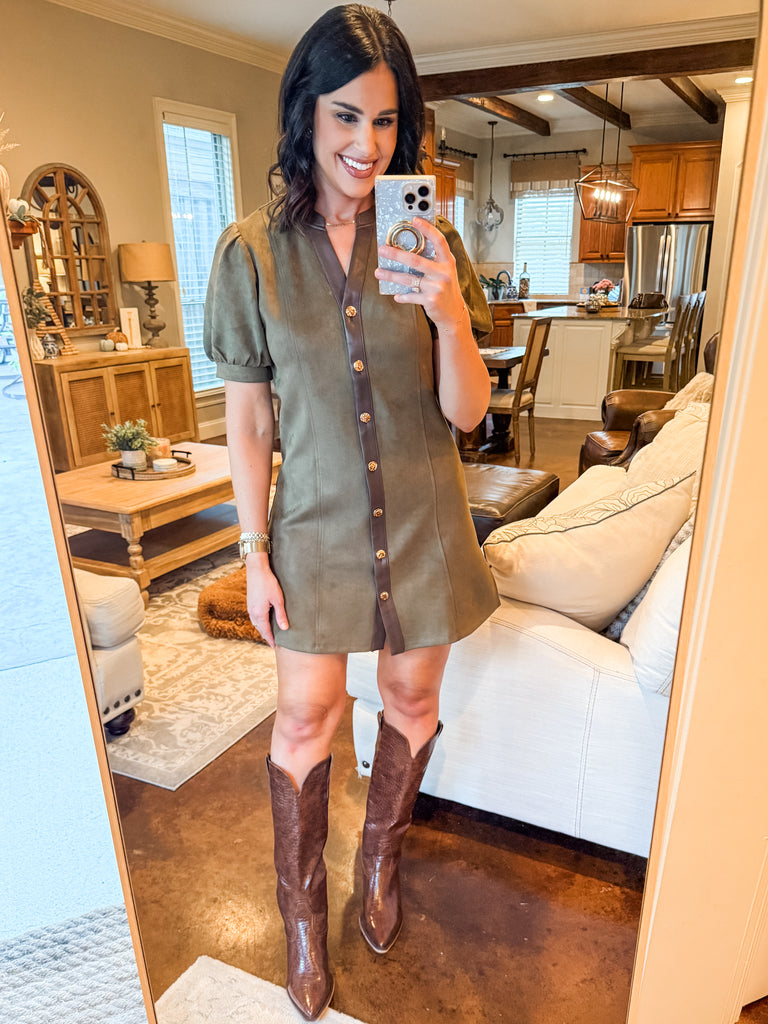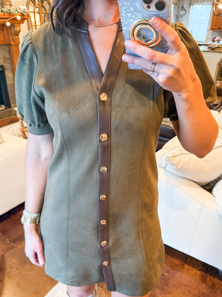 OLIVE SUEDE WITH LEATHER TRIM MINI DRESS