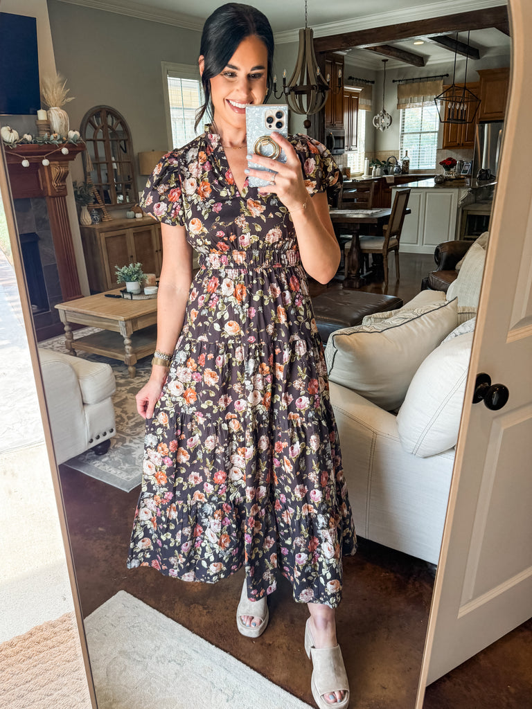 BROWN FLORAL PUFF SLEEVE MAXI DRESS