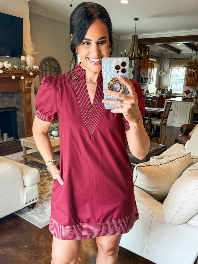BURGUNDY PUFF SLEEVE DRESS WITH STITCH DETAIL