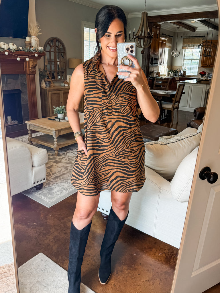 TIGER PRINT SLEEVELESS SHIRT DRESS