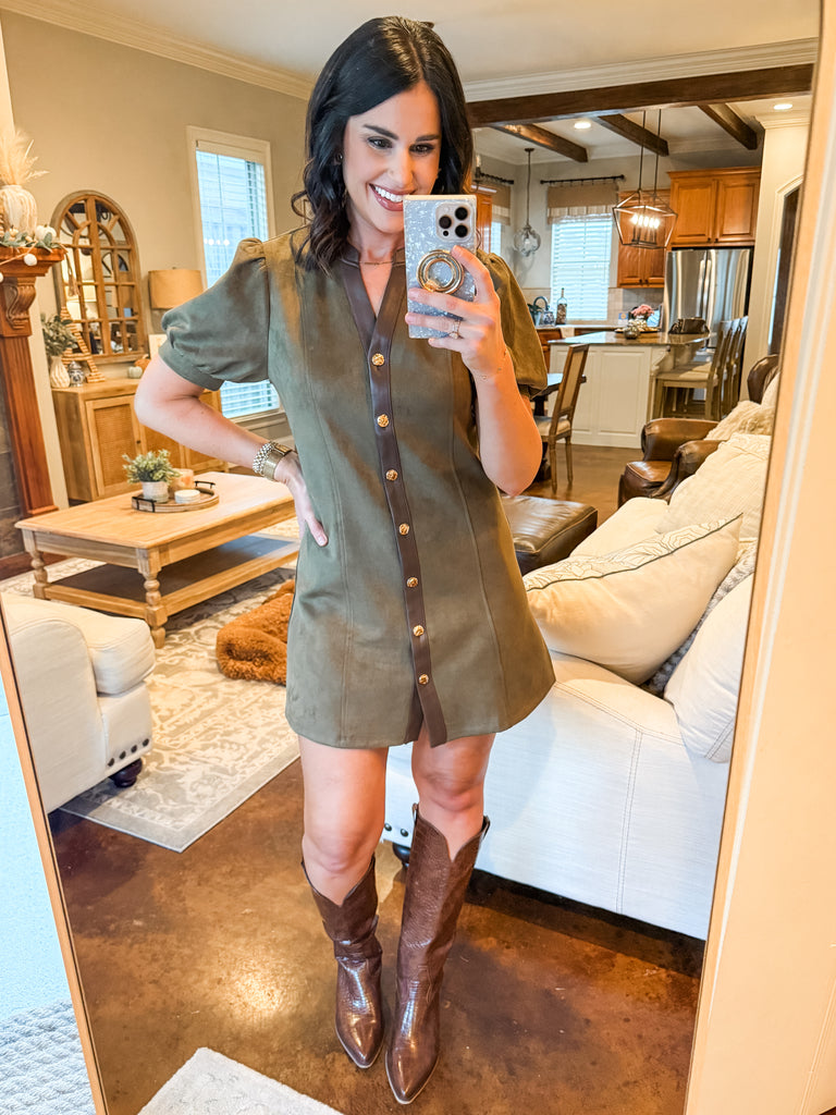 OLIVE SUEDE WITH LEATHER TRIM MINI DRESS