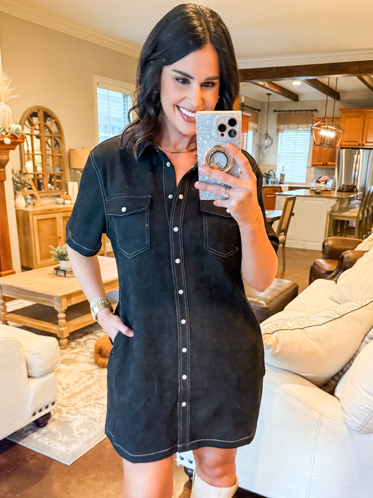 BLACK SUEDE POCKET SHIRT DRESS