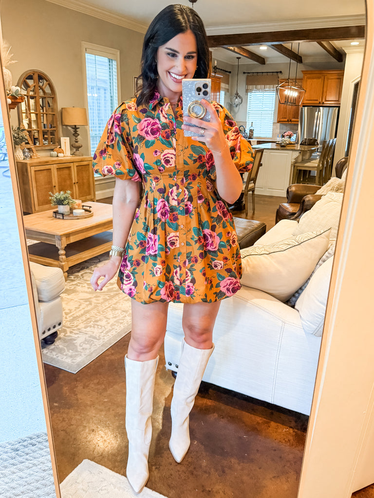 MUSTARD FLORAL BUBBLE HEM SHIRT DRESS