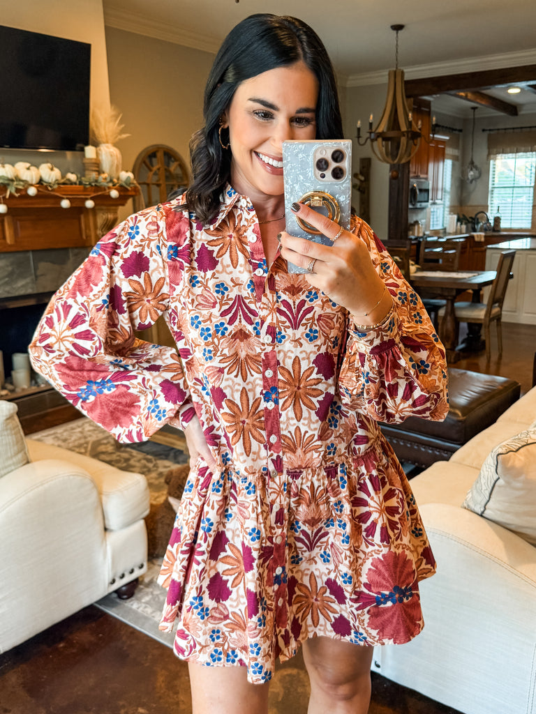 BURGUNDY FLORAL BUTTON DOWN DRESS