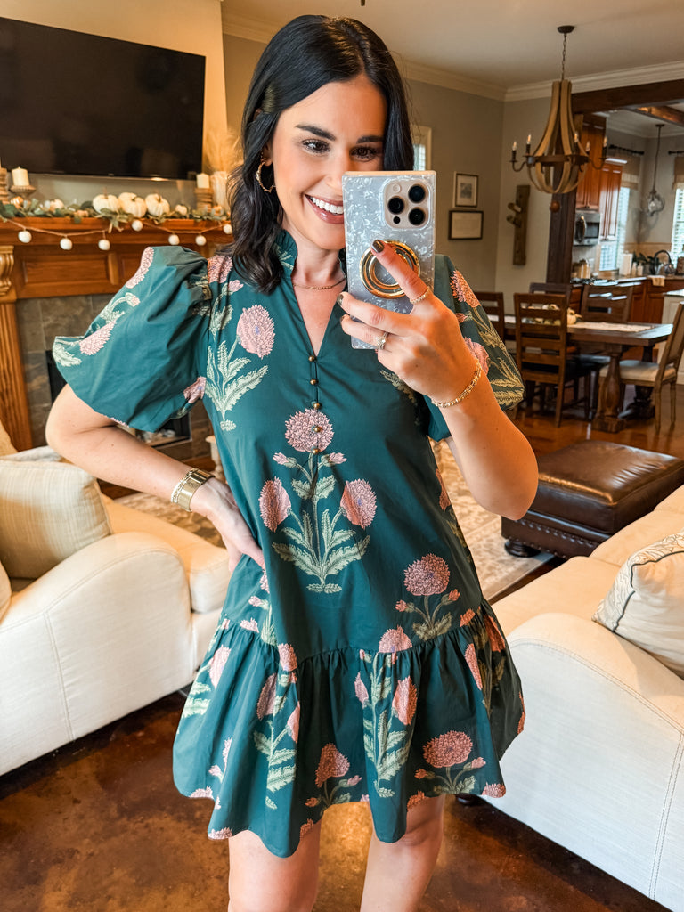 HUNTER GREEN FLORAL RUFFLE HEM DRESS