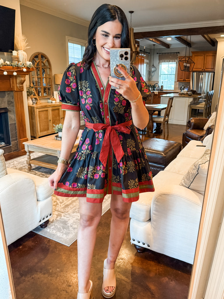 BLACK FLORAL MINI DRESS WITH WINE TRIM