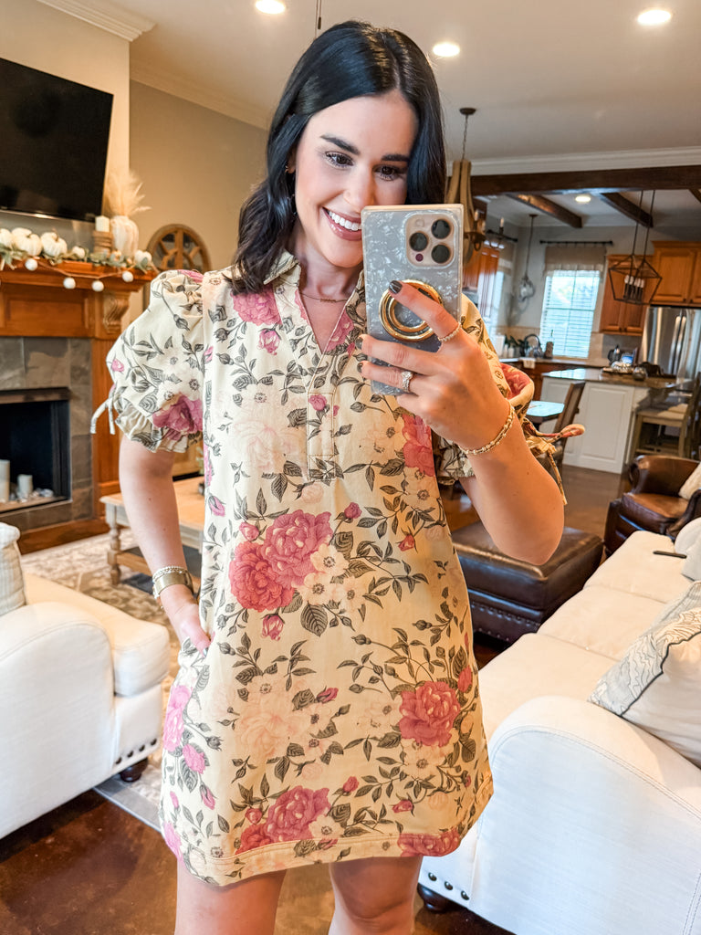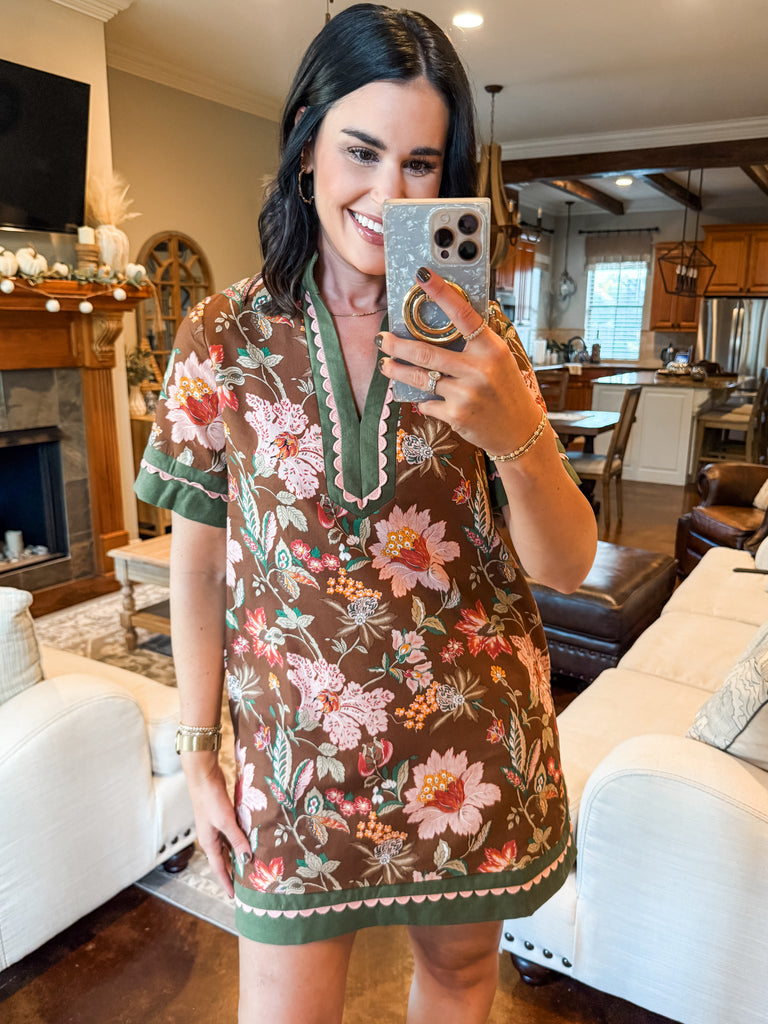BROWN FLORAL SHIFT DRESS WITH OLIVE TRIM