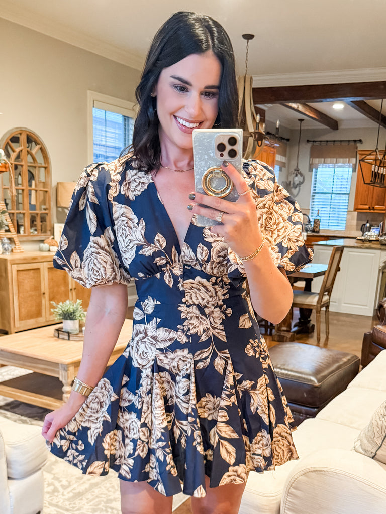 BROWN FLORAL PUFF SLEEVE DRESS WITH STITCH DETAIL