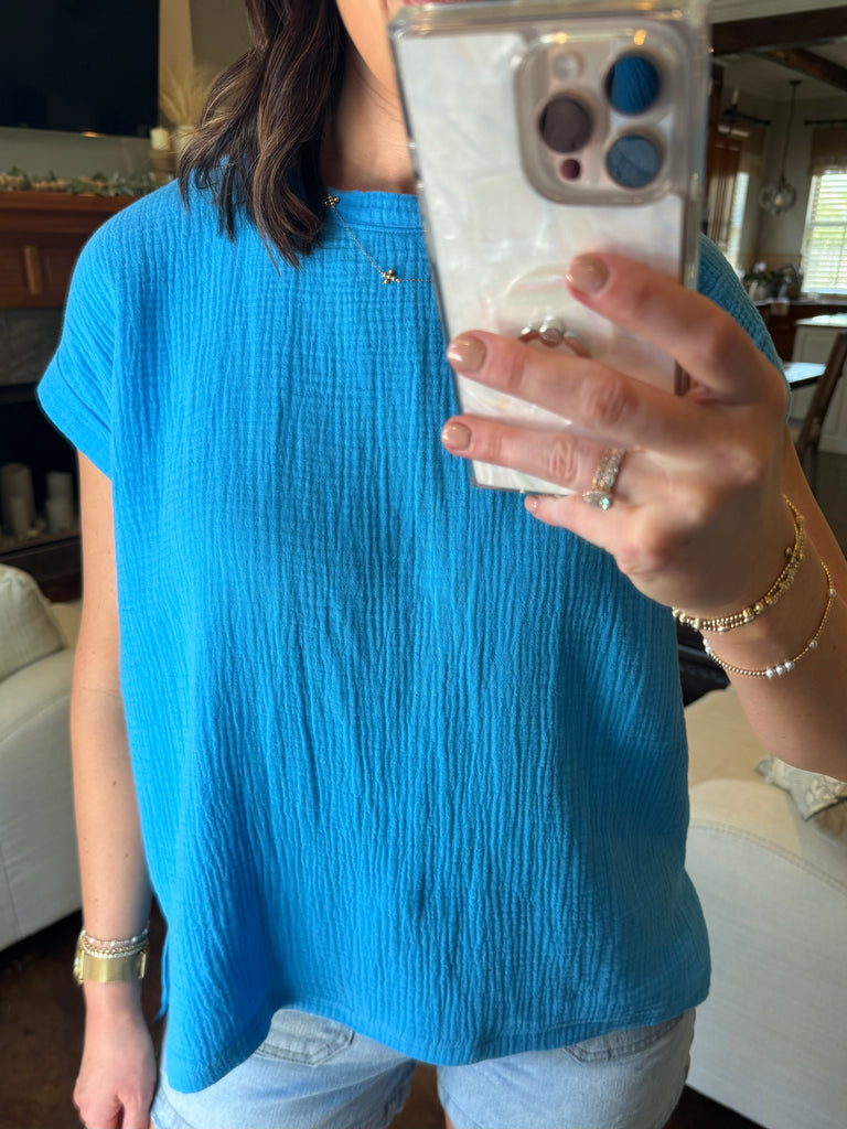 GAUZE SHORT SLEEVE BLUE TOP