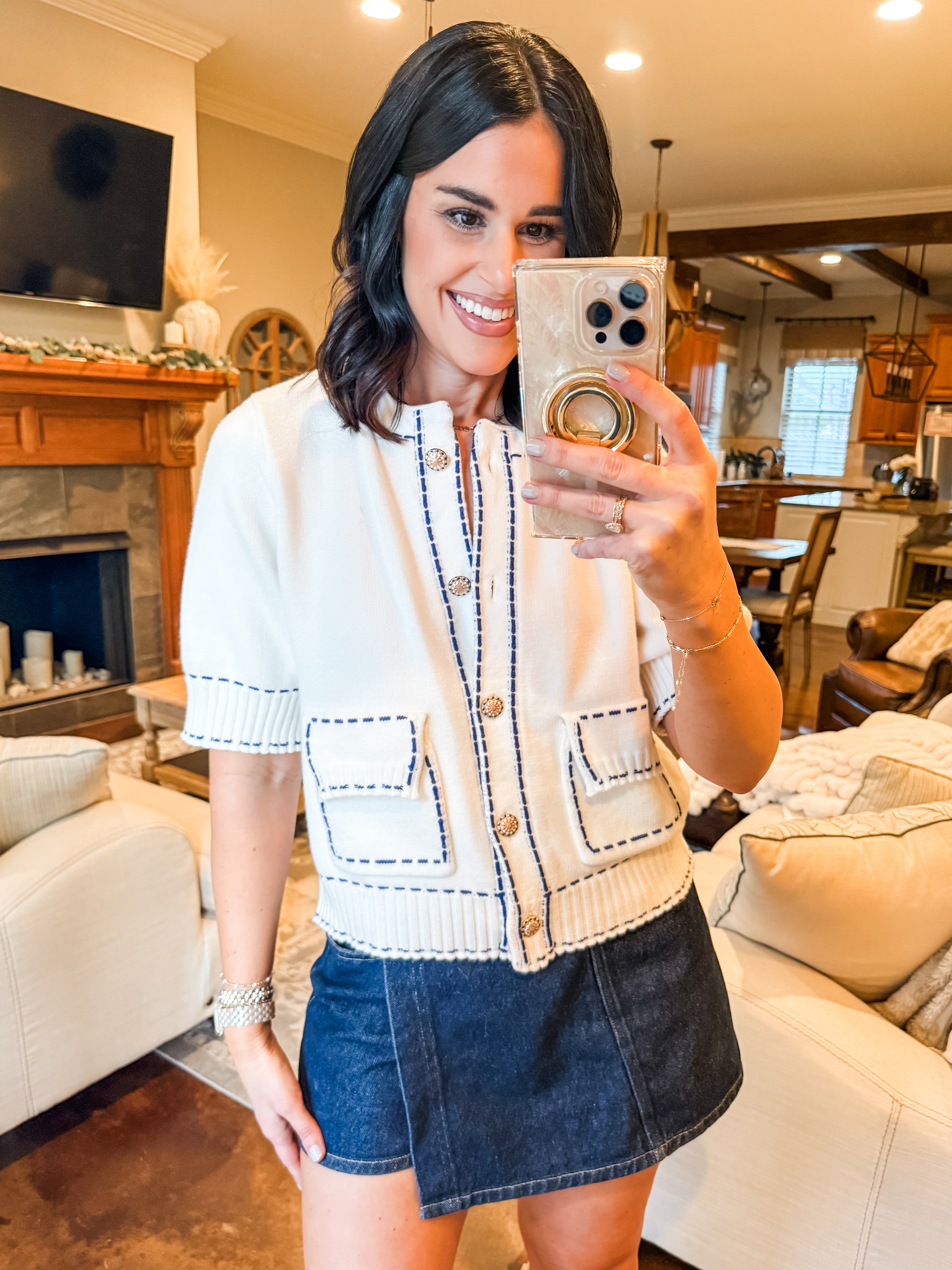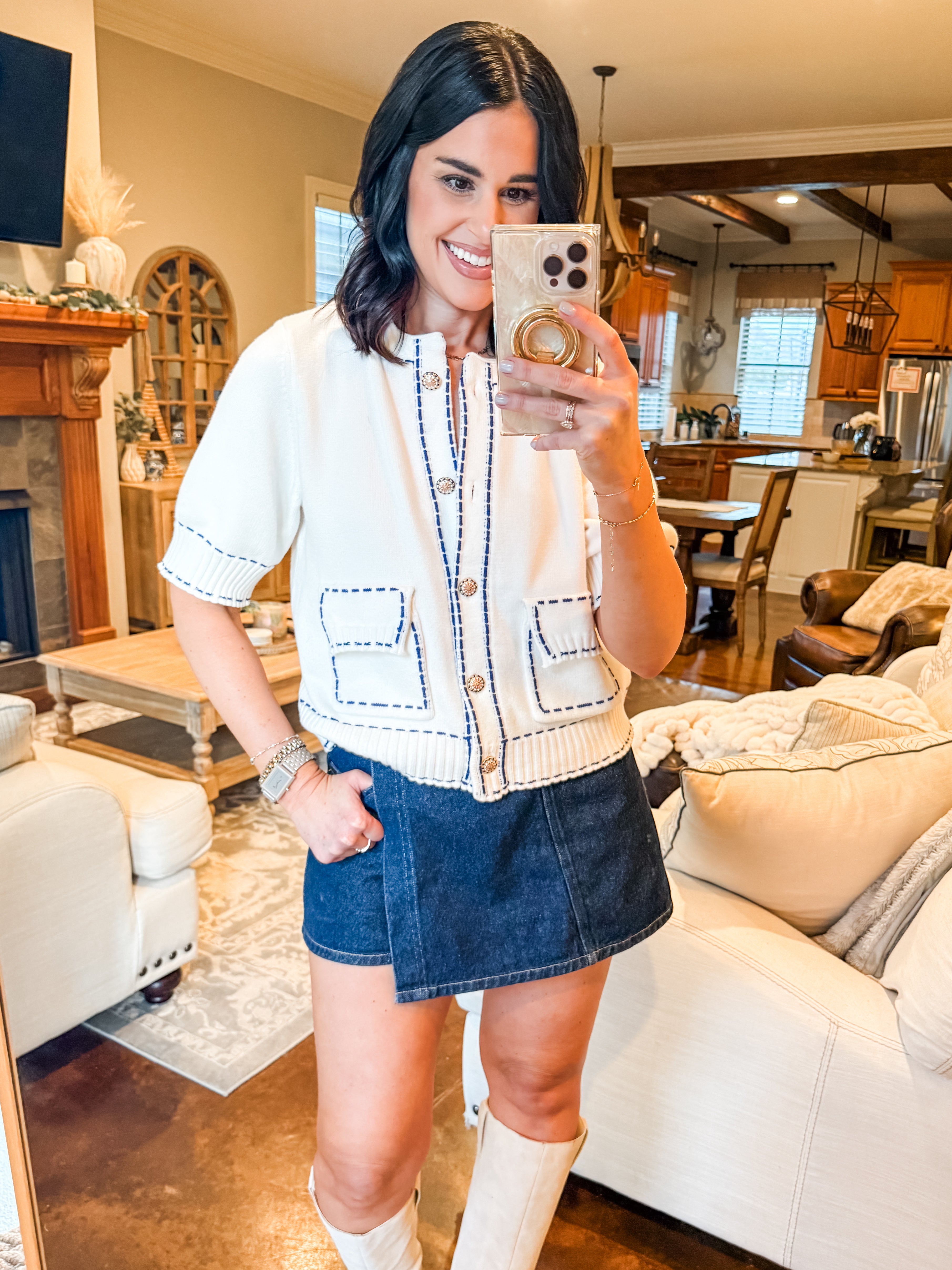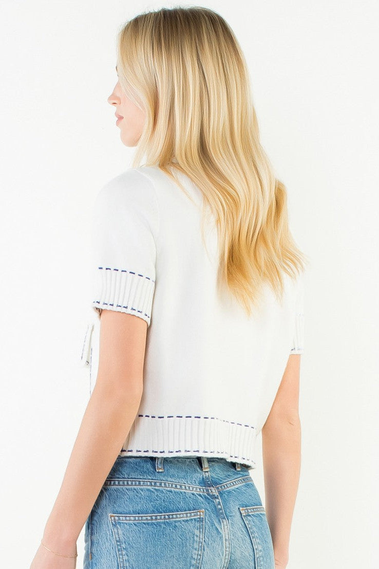 WHITE CARDIGAN WITH NAVY STITCH