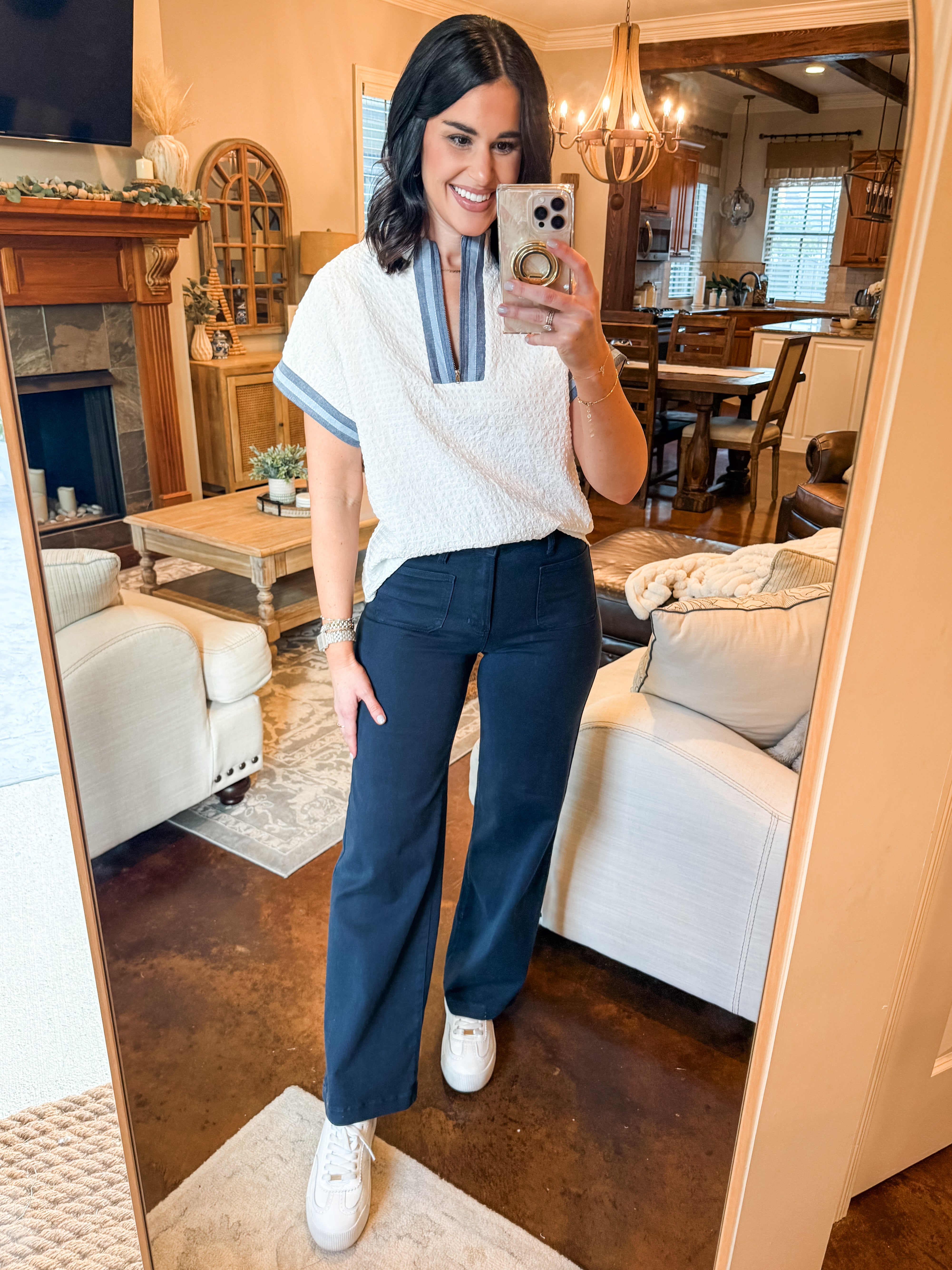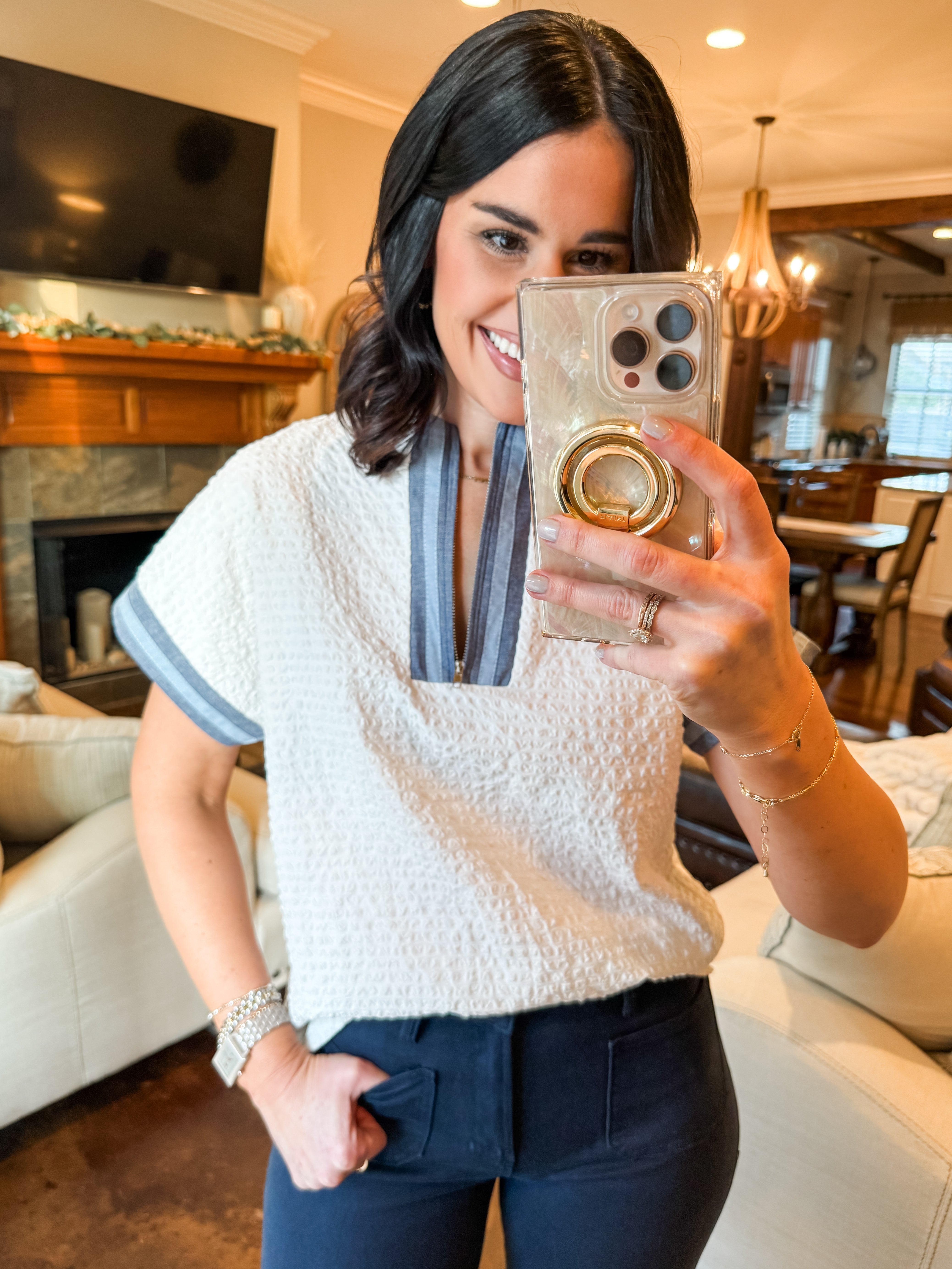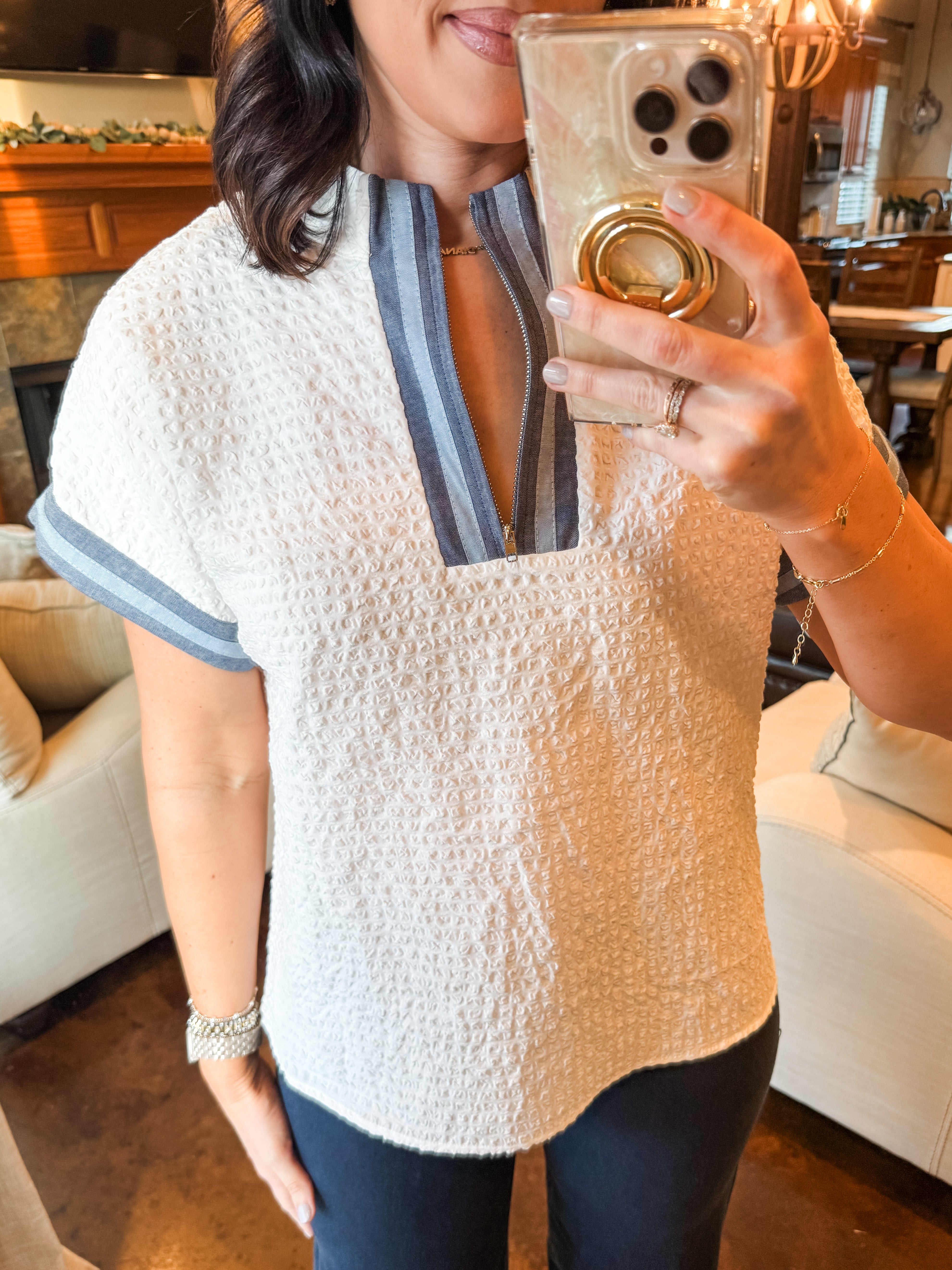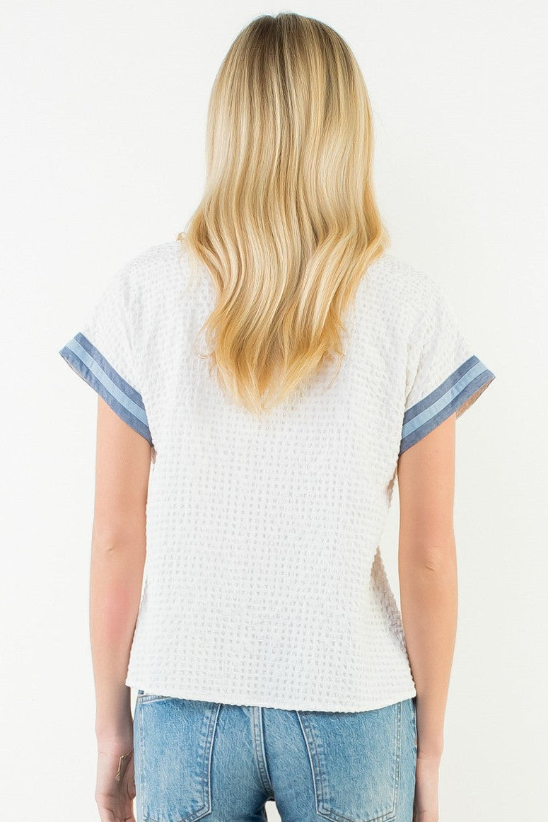 WHITE TEXTURED TOP WITH DENIM TRIM