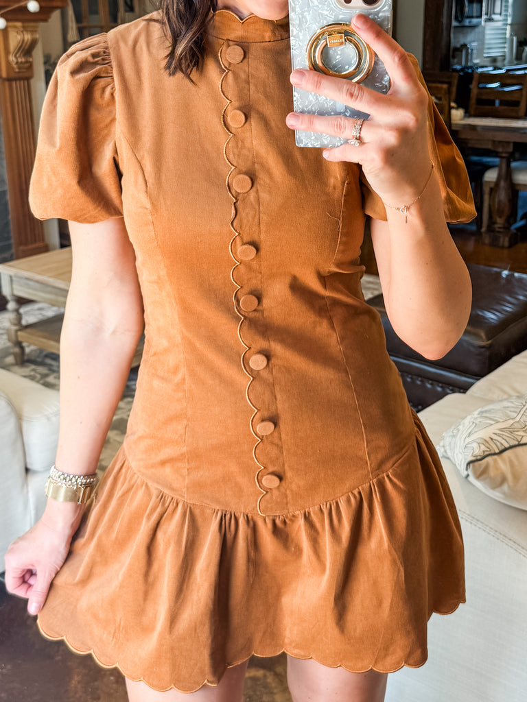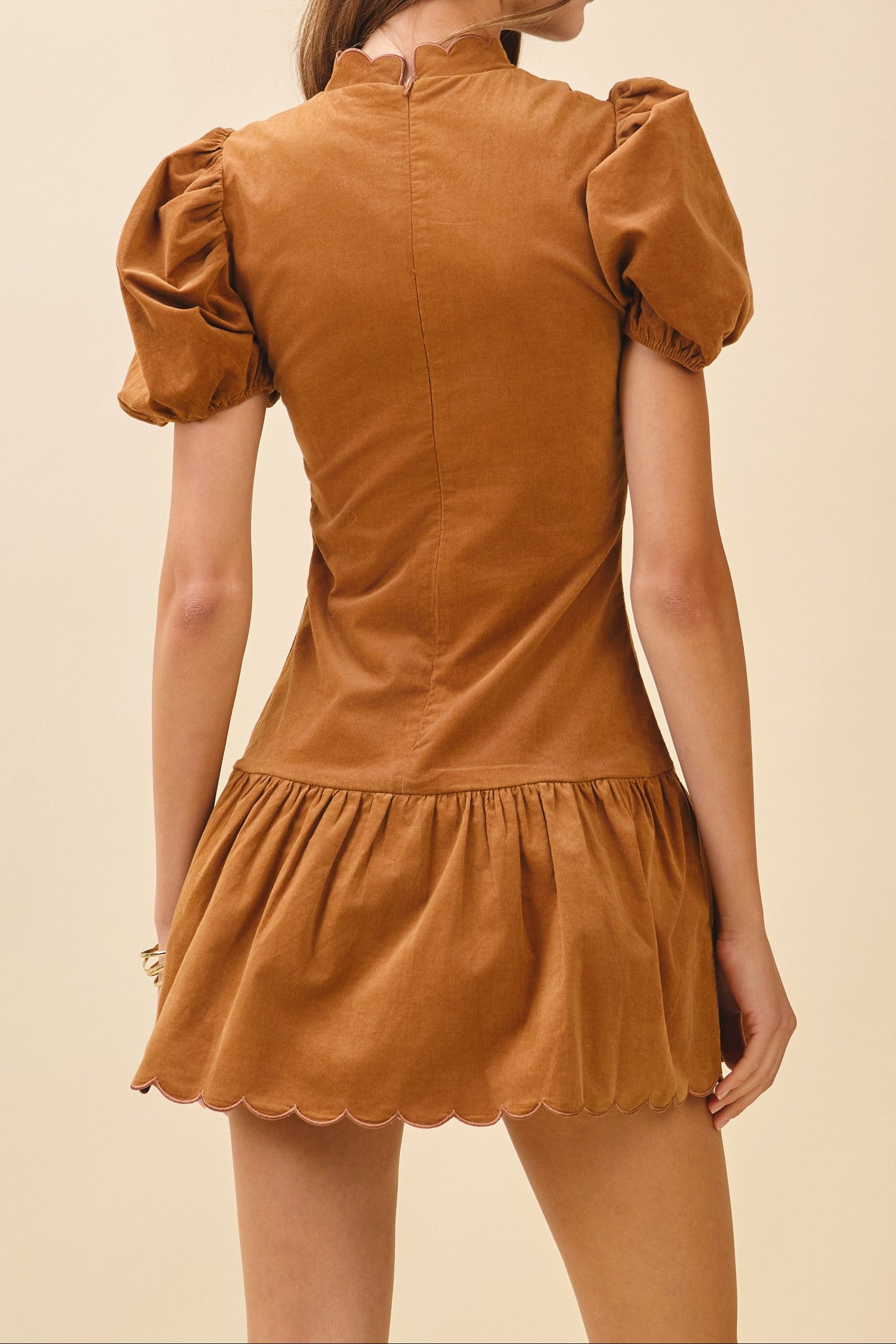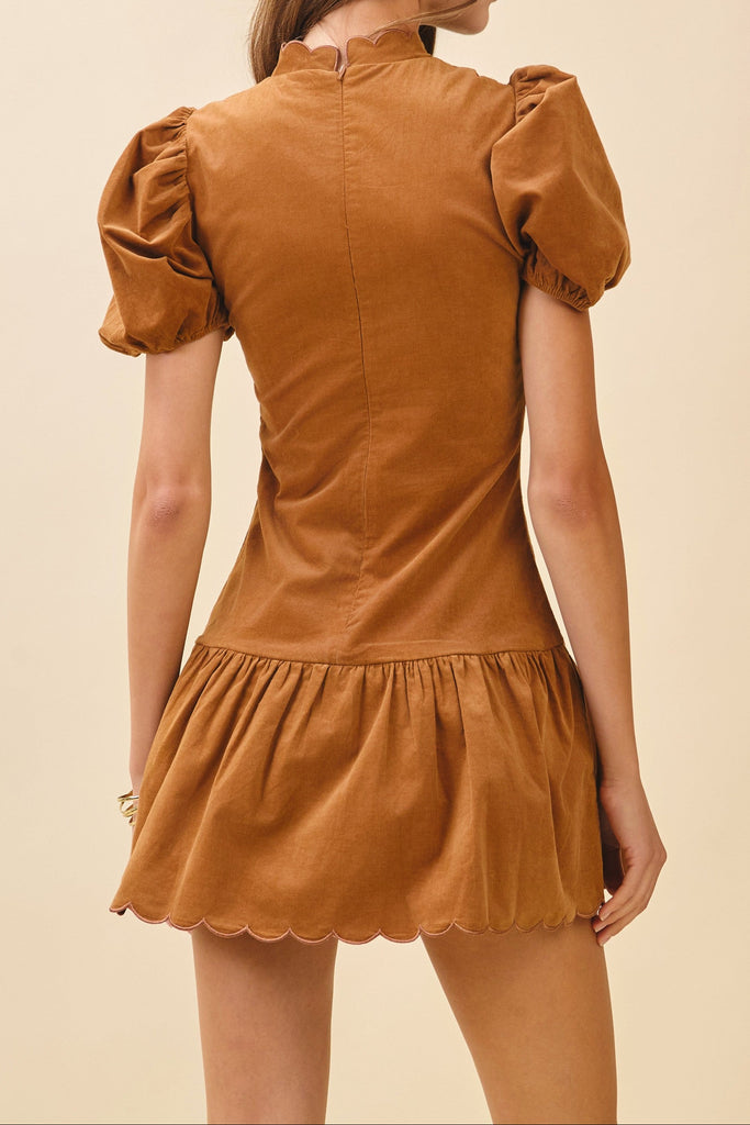 CAMEL CORDUROY RUFFLE HEM DRESS