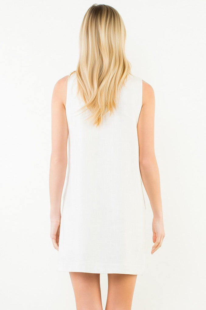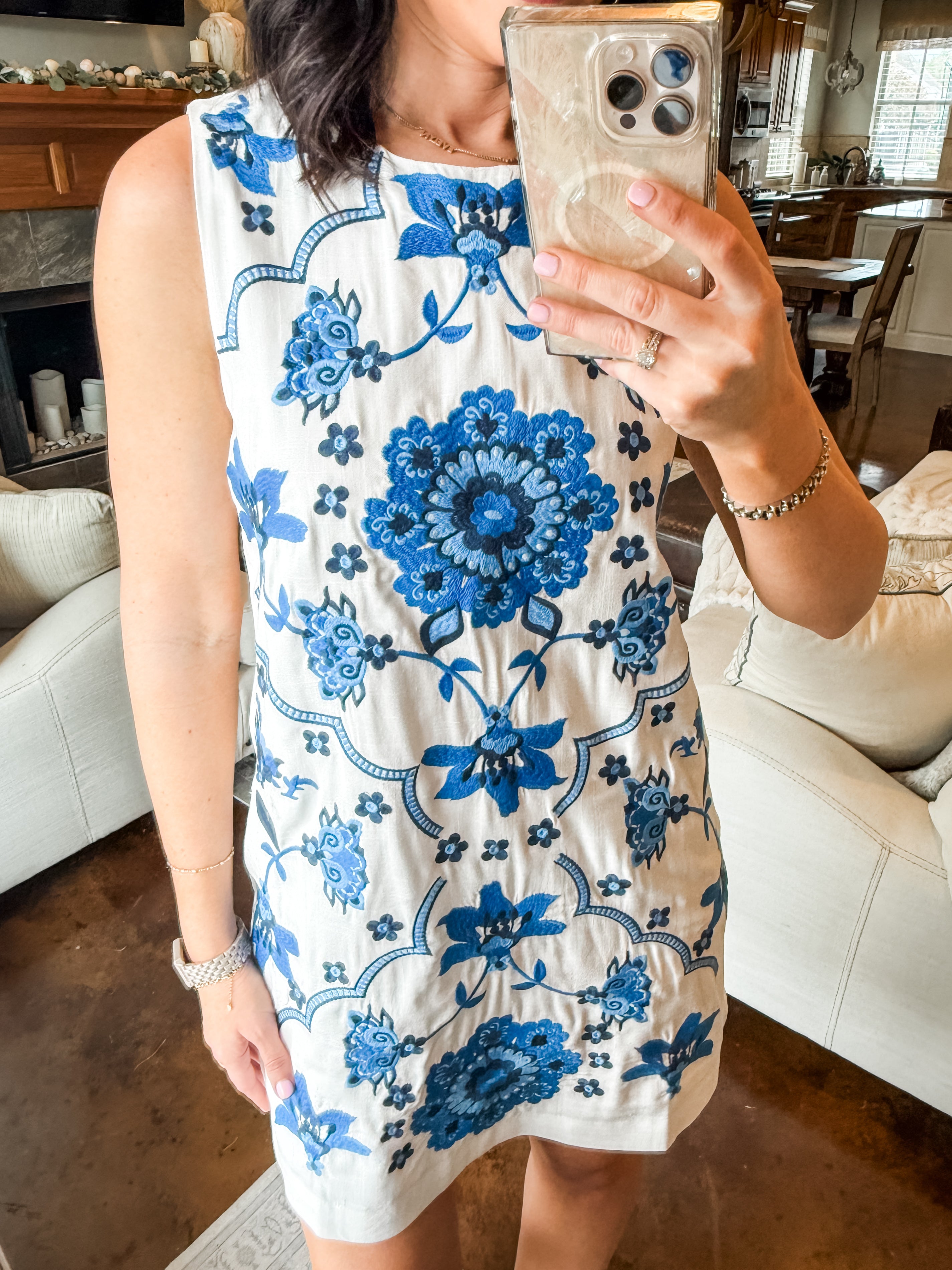 CREAM AND BLUE EMBROIDERED SLEEVELESS DRESS